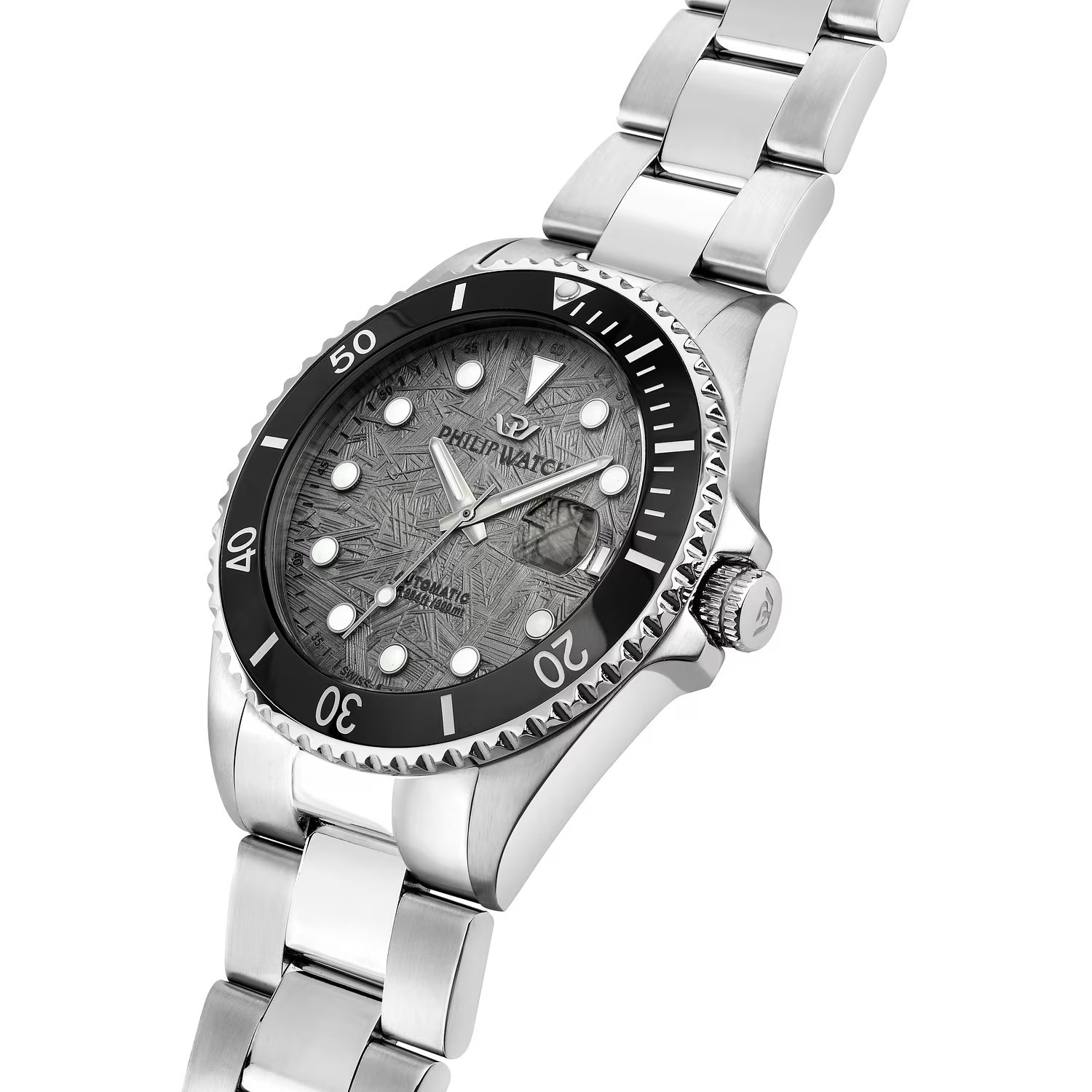 Orologio uomo philip watch, R8223597119, collezione caribe diving, movimento automatico, solo tempo, cassa in acciaio 42mm, quadrante grigio con datario a bolla, Vetro zaffiro, Fondello e corona a vite, Ghiera nera girevole con inserto in ceramica, Valvola ad elio (WR 300m), bracciale in acciaio, resistenza all'acqua 10atm
