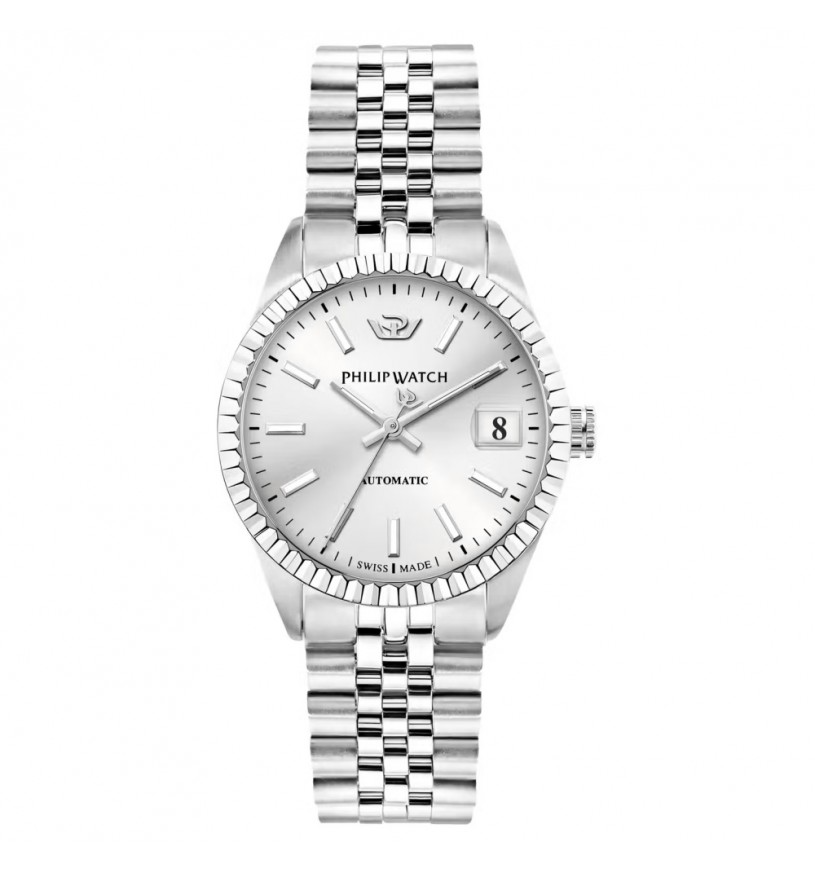 Orologio donna philip watch, R8223597508, collezione caribe, movimento automatico, solo tempo, cassa in acciaio 35mm con ghiera zigrinata, vetro zaffiro, cinturino in metallo, resistente all'acqua 10atm