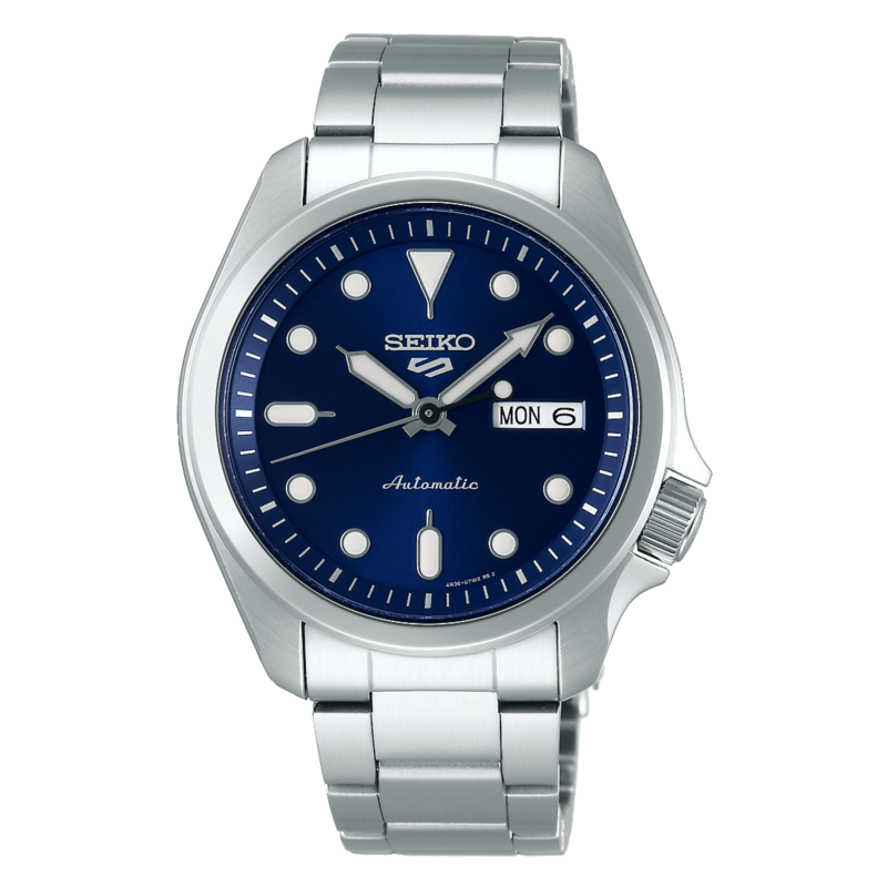 Orologio uomo seiko, Srpe53k1, collezione 5 sport, movimento automatico, solo tempo, cassa in acciaio 40mm, quadrante blu con datario, bracciale in acciaio, resistenza all'acqua 10atm
