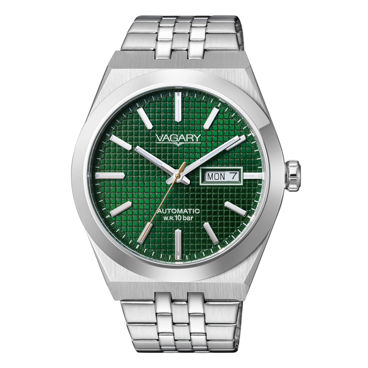 Orologio uomo vagary, IX3-513-41, collezione gear matic 101th, movimento automatico, solo tempo, cassa in acciaio 40mm, quadrante verde con datario, bracciale in acciaio, resistenza all'acqua 10atm