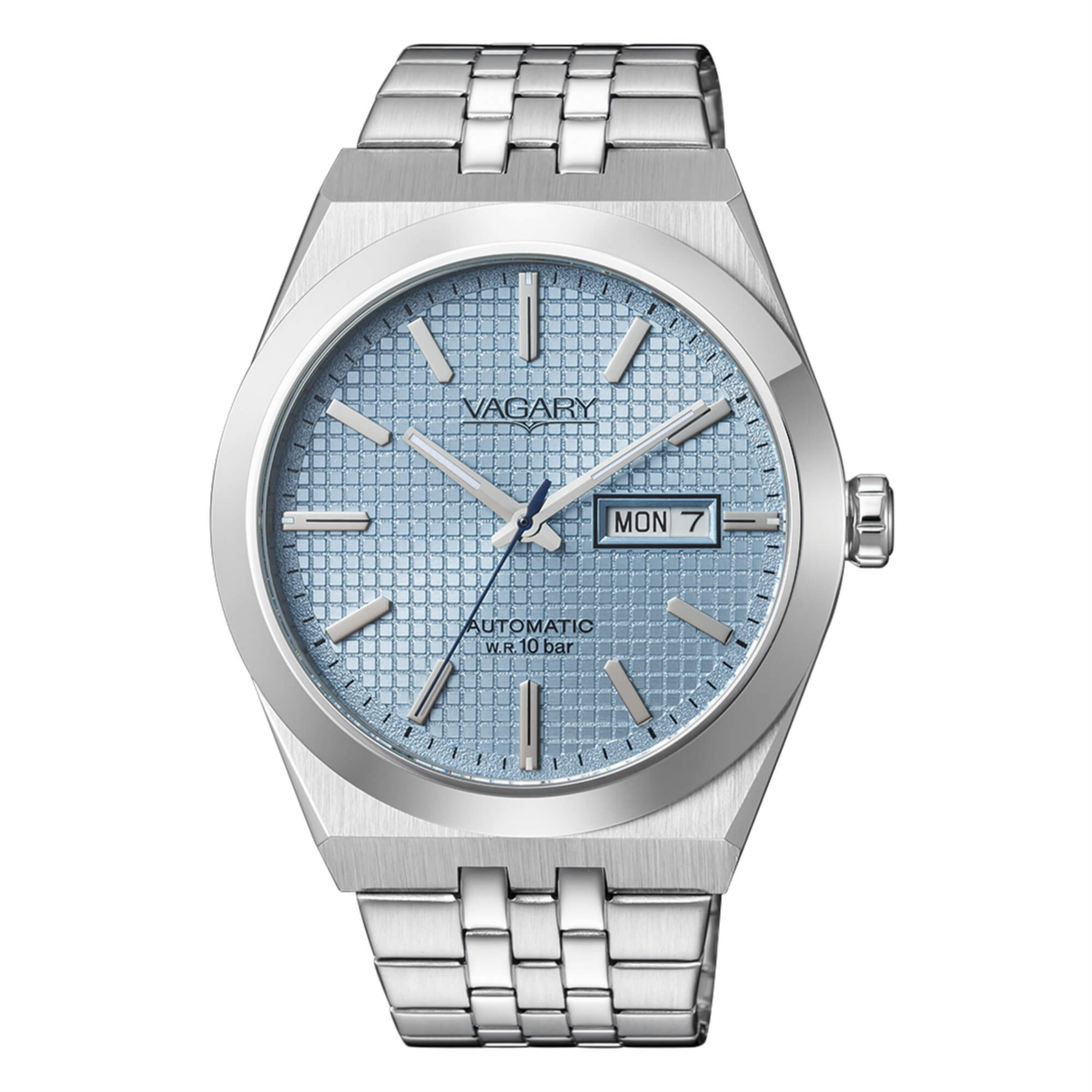 Orologio uomo vagary, IX3-513-71, collezione gear matic 101th, movimento automatico, solo tempo, cassa in acciaio 40mm, quadrante azzurro con datario, bracciale in acciaio, resistenza all'acqua 10atm