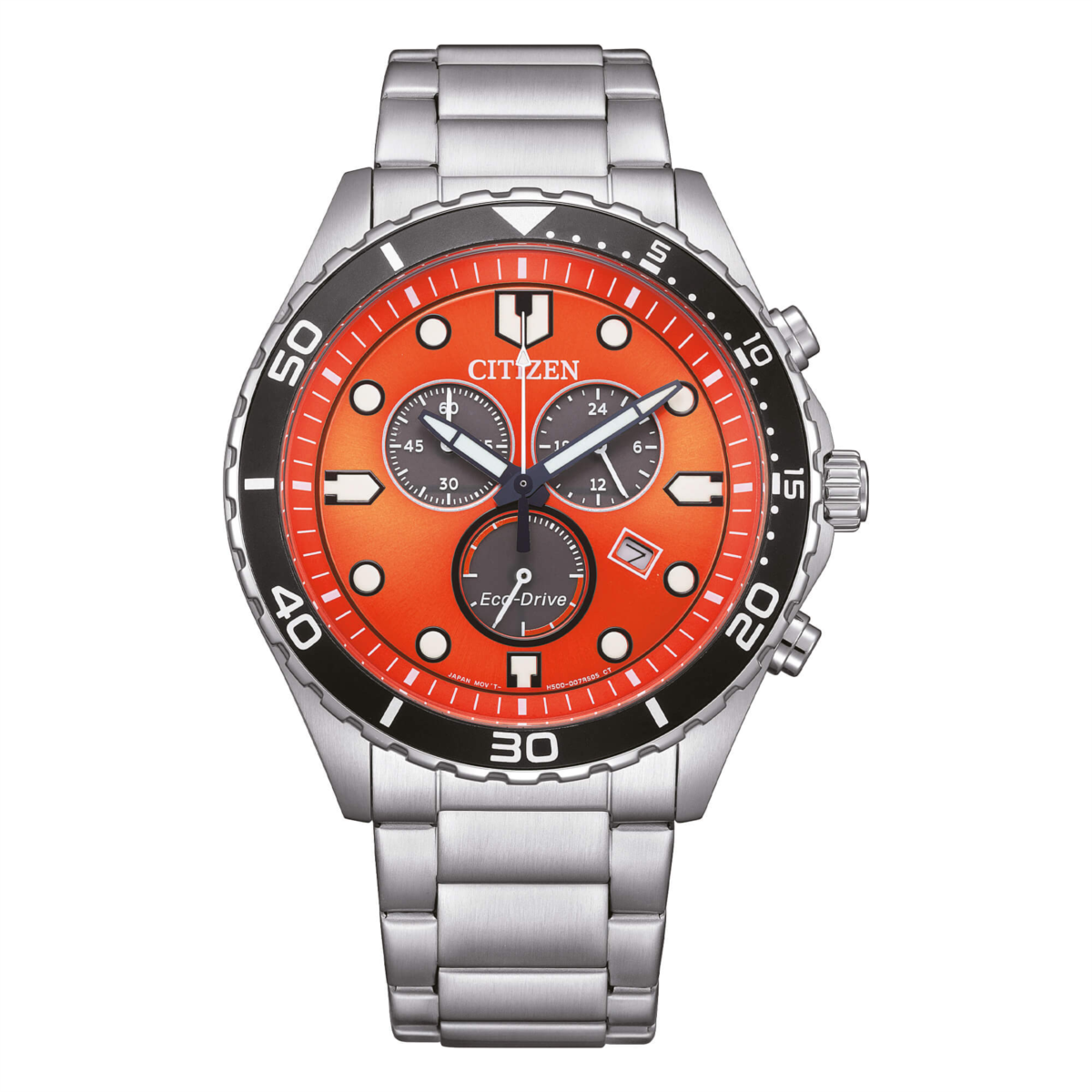 Orologio uomo citizen, AT2560-84X, collezione active, movimento eco-drive, cronografo, cassa in acciaio 43mm, quadrante arancione con datario, bracciale in acciaio, resistenza all'acqua 10atm