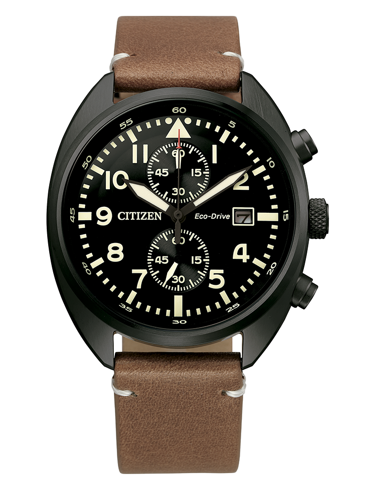 Orologio uomo citizen, Ca7045-14e, collezione Metropolitan, movimento eco-drive, cronografo, cassa in acciaio nero 41mm, quadrante nero con datario, cinturino in pelle marrone, resistenza all'acqua 10atm