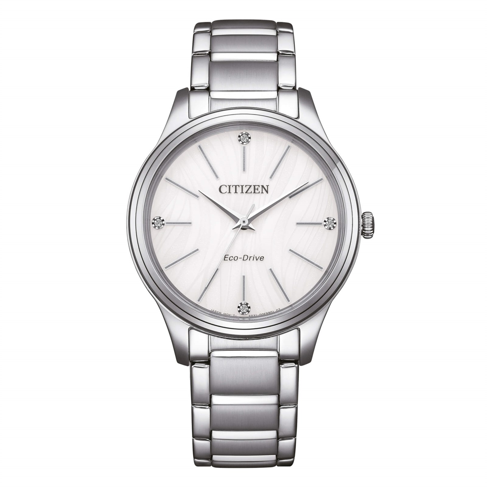 Orologio donna citizen, EM1220-58A, collezione elegant, movimento eco drive, solo tempo, cassa in acciaio 34mm, quadrante bianco, bracciale in acciaio, resistenza all'acqua 5atm