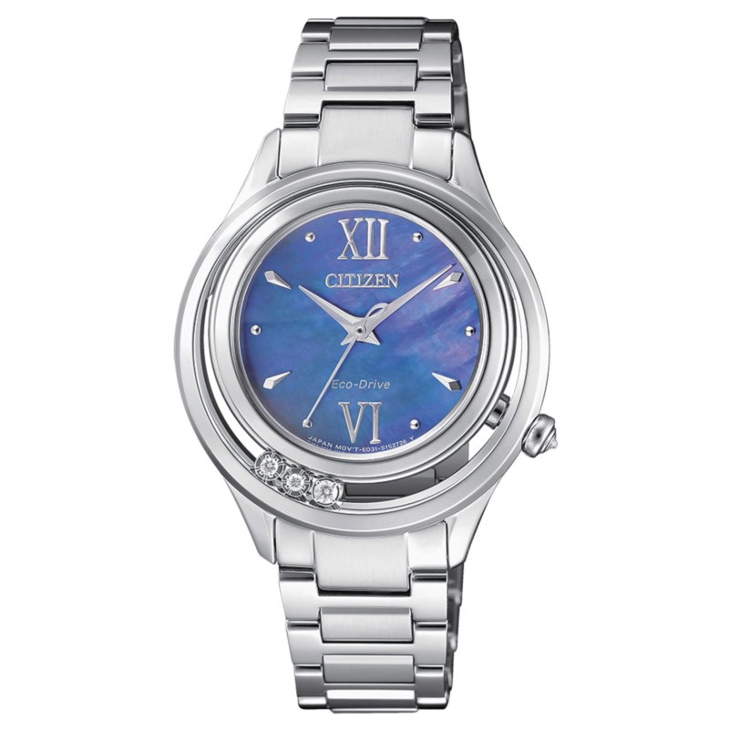 Orologio donna citizen, Em0510-88n, collezione lady, movimento eco-drive, solo tempo, cassa in acciaio con 3 diamanti 32, 5cm, quadrante blu, bracciale in acciaio, resistenza all'acqua 5atm