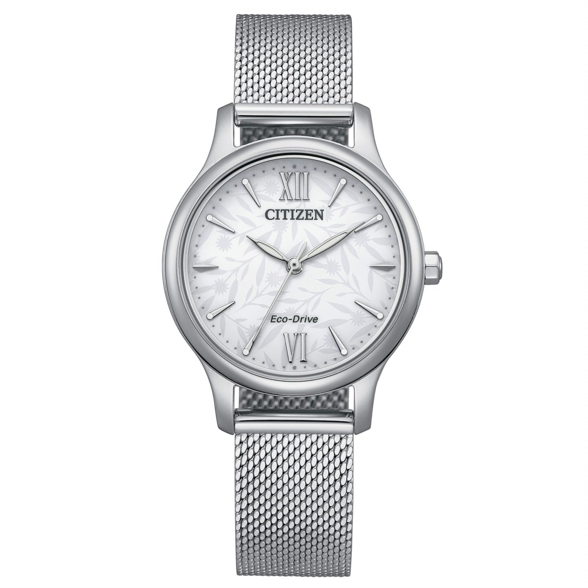 Orologio donna citizen, Em0899-81a, collezione lady, movimento eco-drive, solo tempo, cassa in acciaio 30mm, quadrate silver con motivi floreali, cinturino in maglia milano, resistenza all'acqua 5atm