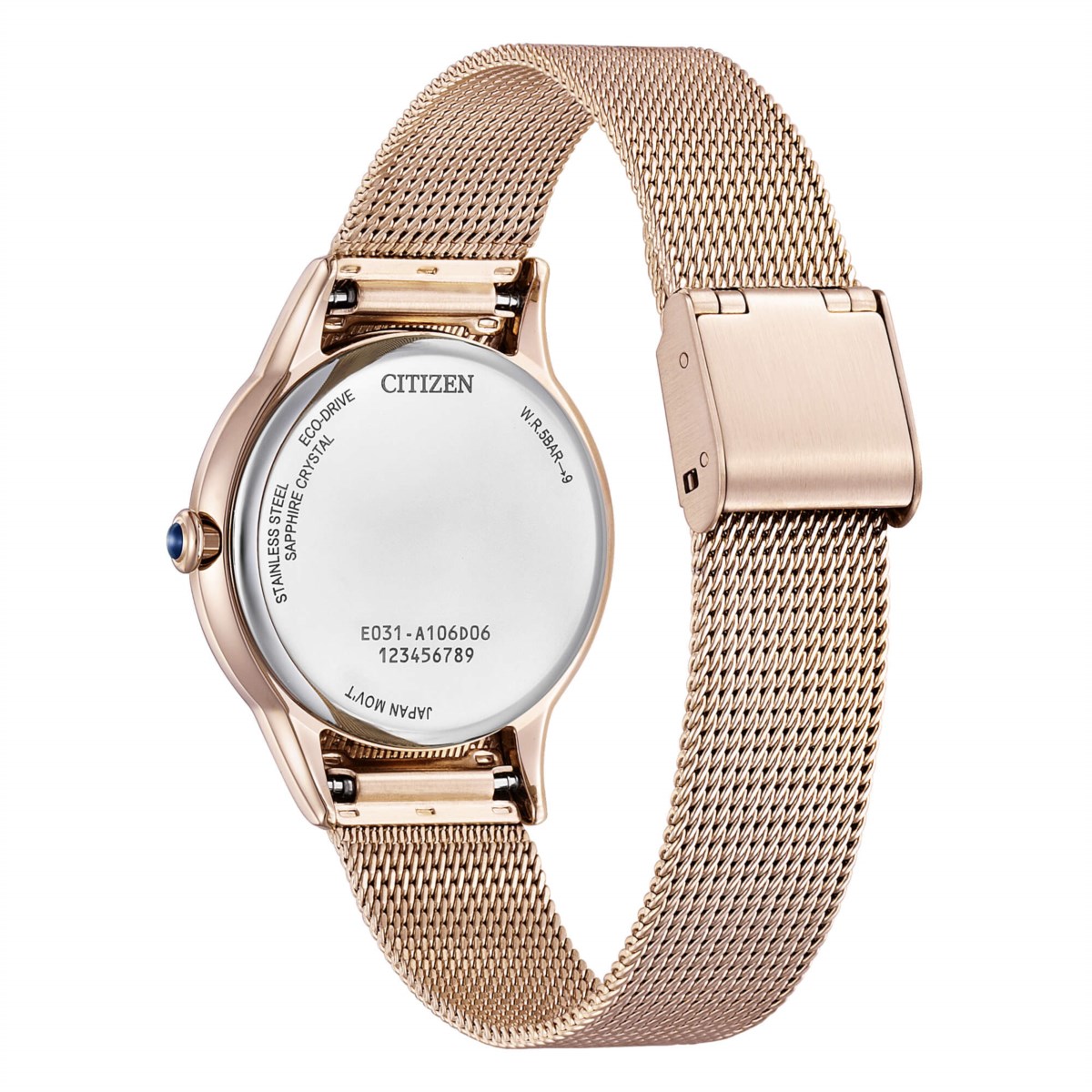 Orologio donna citizen, EM1153-88A, collezione lady, movimento eco drive, solo tempo, cassa in acciaio rosa 32mm, quadrante bianco, cinturino in maglia milano rosato, resistenza all'acqua 5 bar