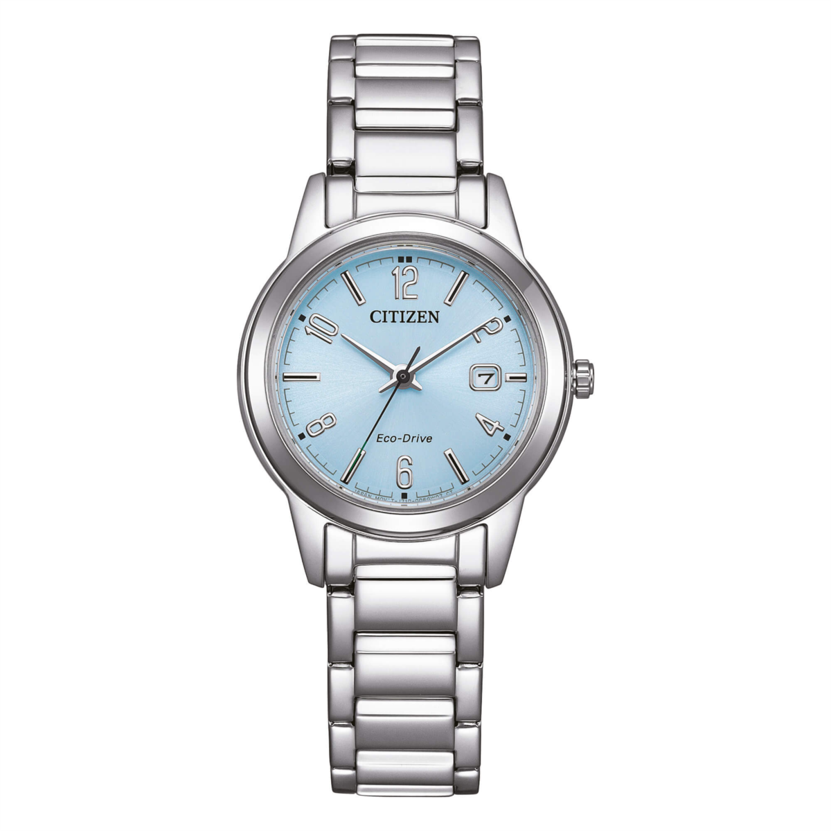 Orologio donna citizen, FE1241-71L, collezione lady, movimento eco-drive, solo tempo, cassa in acciaio 29mm, quadrante azzurro con datario, bracciale in acciaio, resistenza all'acqua 3atm