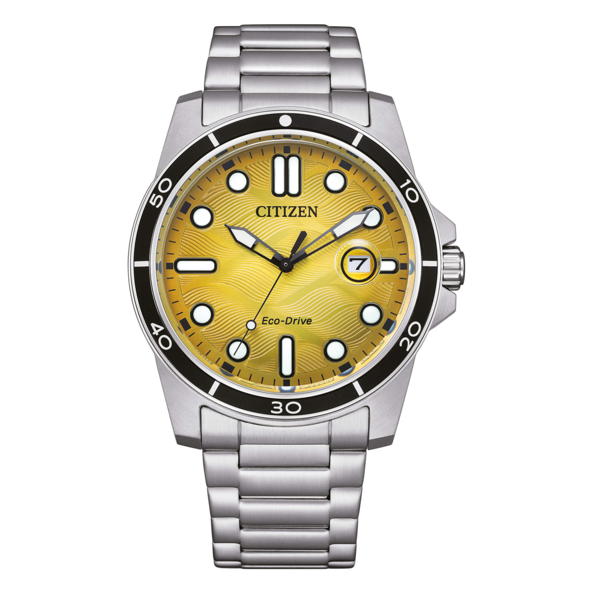 Orologio uomo citizen, AW1816-89X, collezione marine, movimento eco-drive, solo tempo, cassa in acciaio 42mm, quadrante giallo con datario a bolla, bracciale in acciaio, resistenza all'acqua 10atm