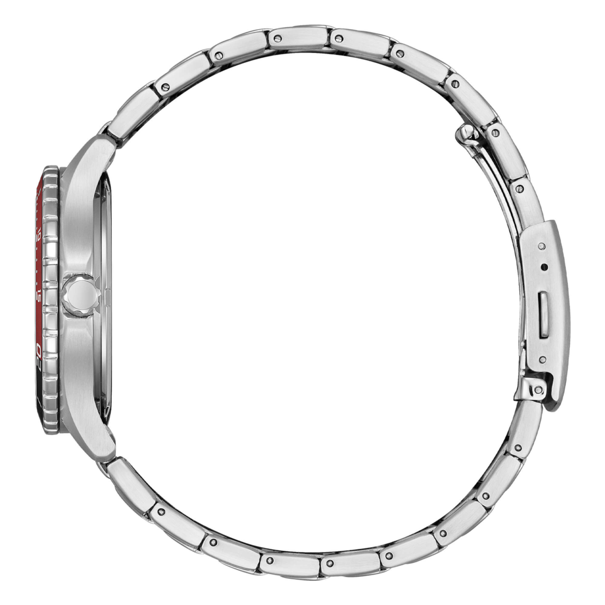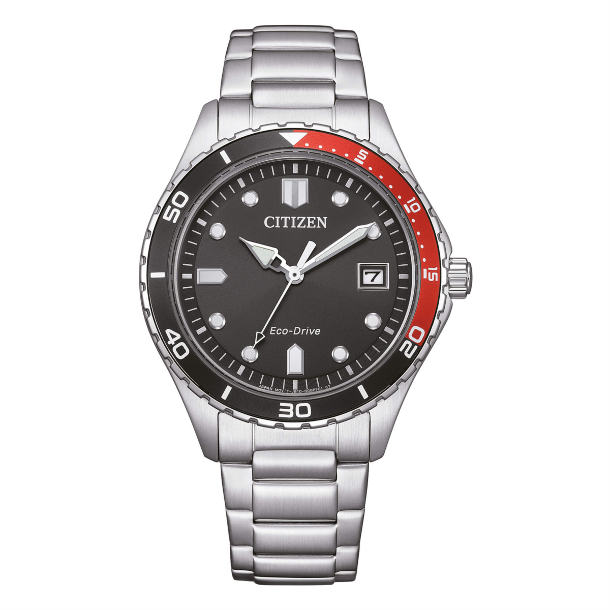 Orologio unisex citizen, AW1820-81E, collezione marine, movimento eco-drive, solo tempo, cassa in acciaio 36mm, quadrante nero con datario, bracciale in acciaio, resistenza all'acqua 10atm