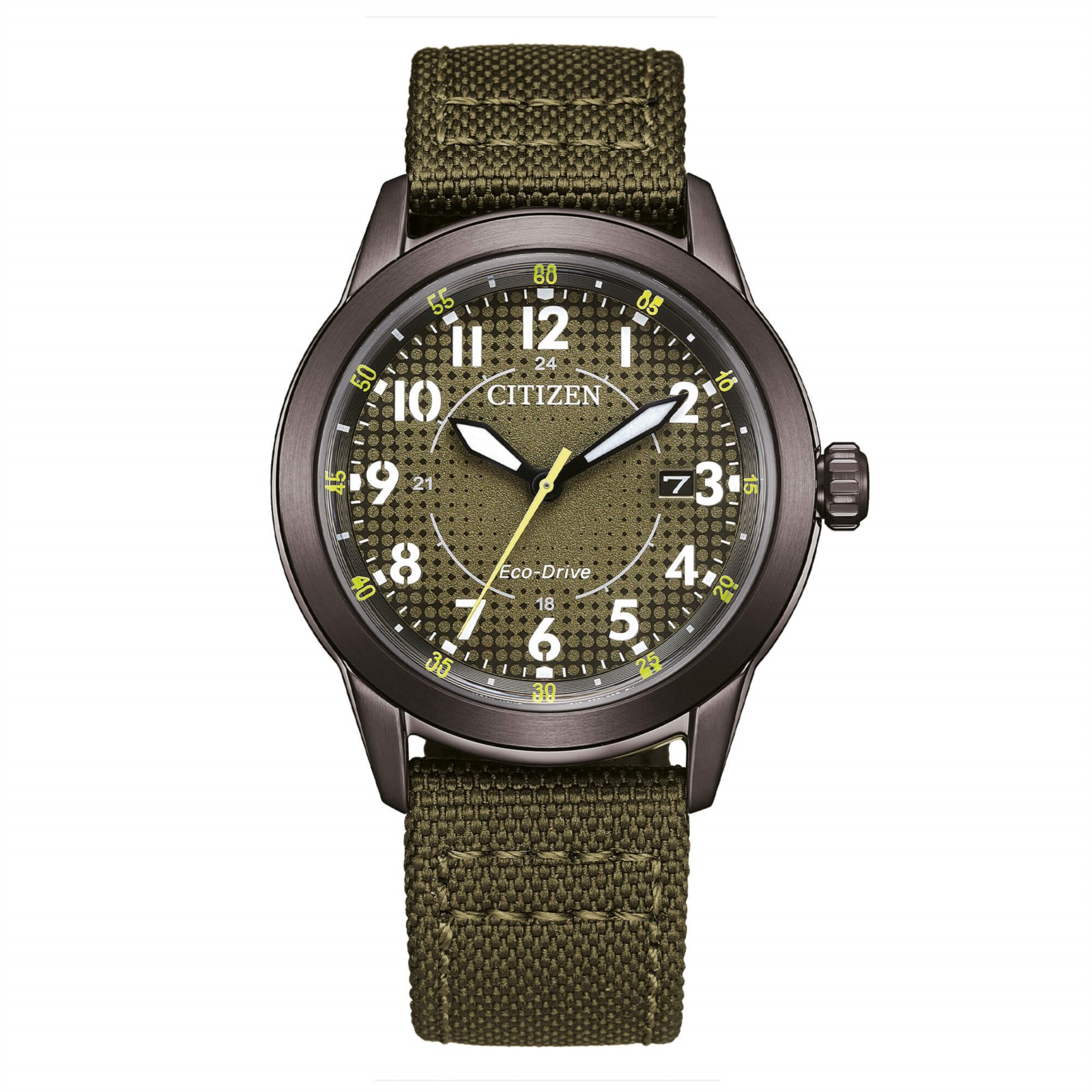 Orologio uomo citizen, AW1877-09X, collezione military, movimento eco drive, solo tempo, cassa in acciaio 40mm, cinturino in nylon colore verde militare. resistenza all'acqua 10atm.