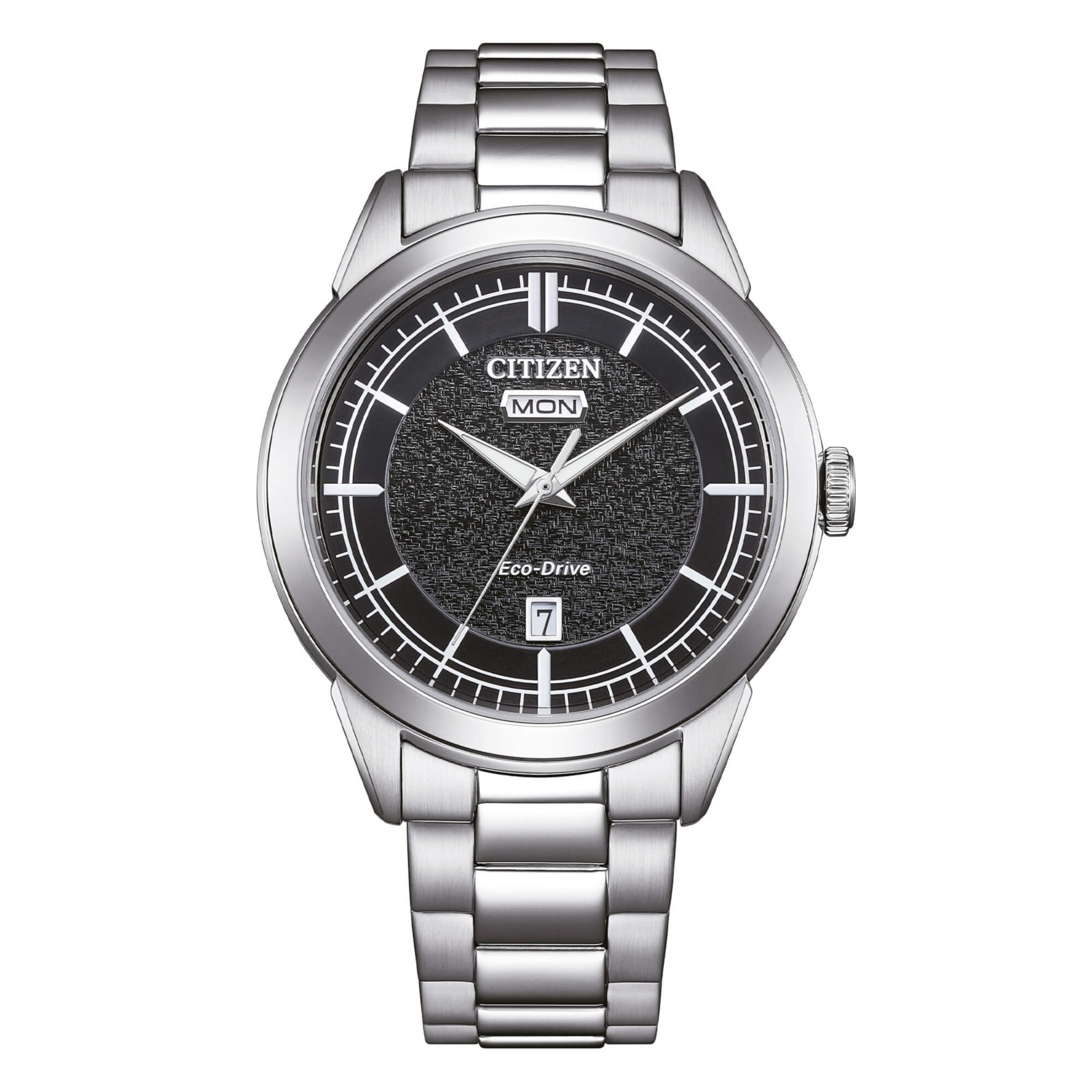 Orologio uomo citizen, AW0151-85E, collezione of action, movimento eco-drive, solo tempo, cassa in acciaio 40mm, quadrante nero con datario, bracciale in acciaio, resistenza all'acqua 10atm.