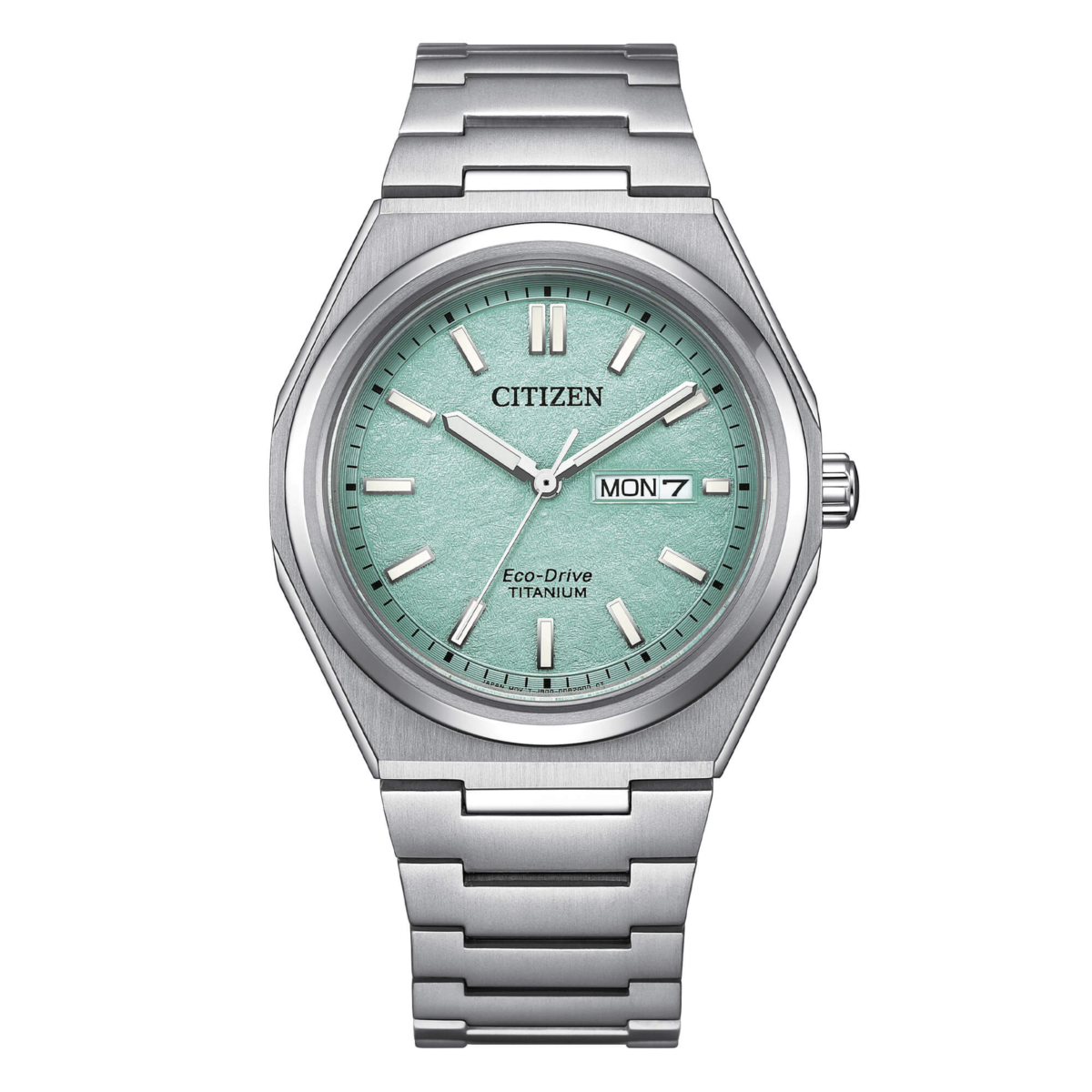 Orologio uomo citizen, AW0130-85M, collezione super titanium, movimento eco drive, solo tempo, cassa in titanio 40mm, quadrante turchese con datario, bracciale in titanio, resistenza all'acqua 10atm