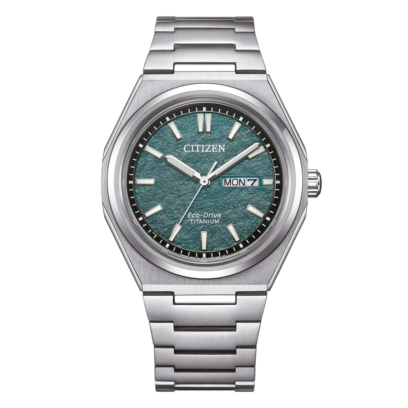 Orologio uomo citizen, AW0130-85X, collezione super titanium, movimento eco drive, solo tempo, cassa in titanio 40mm, quadrante verde con datario, vetro zaffiro, bracciale in titanio, resistenza all'acqua 10 bar