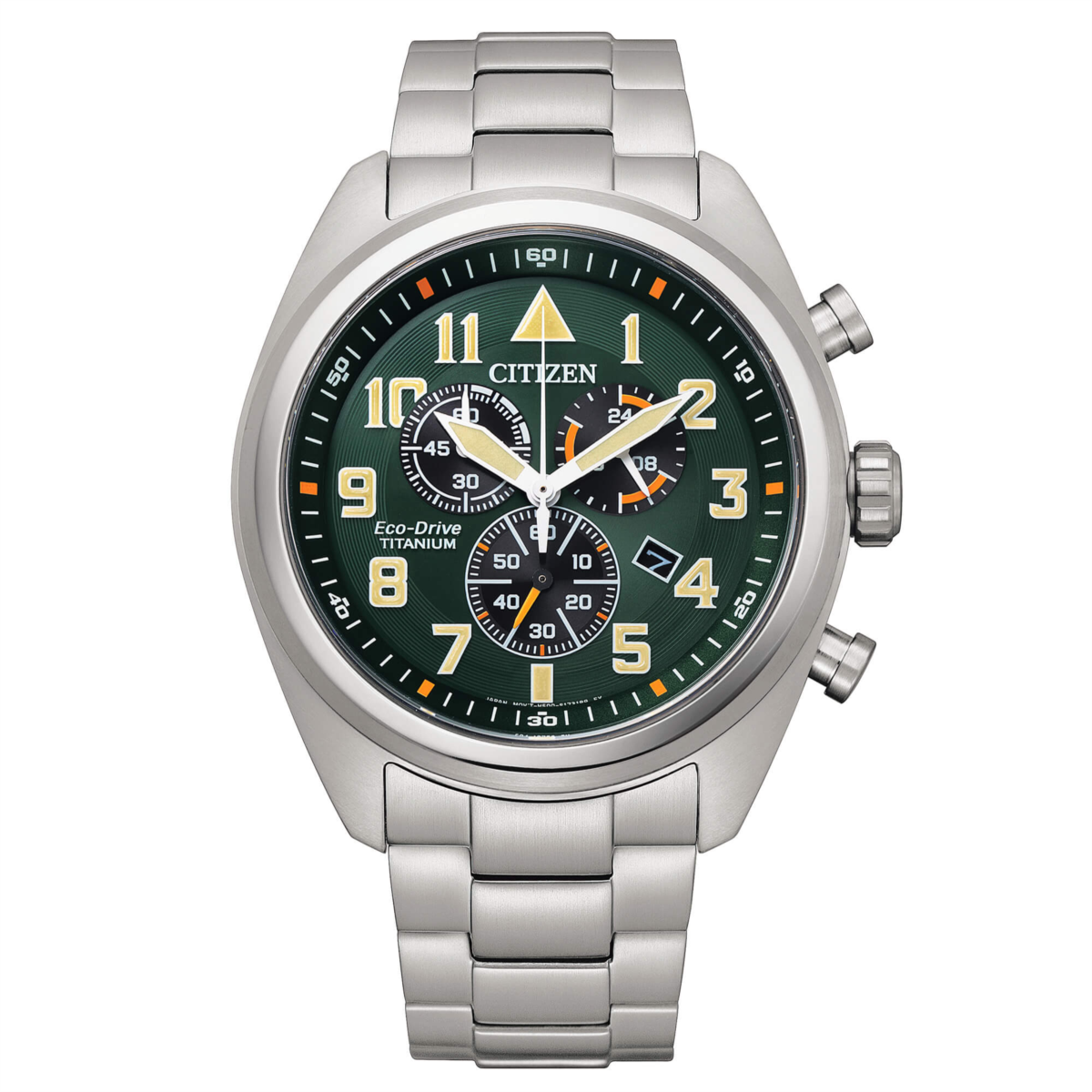 Orologio uomo citizen, AT2480-81X, collezione super titanium chrono, movimento eco-drive, cronografo, cassa in super titanio 43mm, quadrante verde con datario, fondello serrato a vite, vetro zaffiro, bracciale in super titanio con chiusura di sicurezza, resistenza all'acqua 10atm