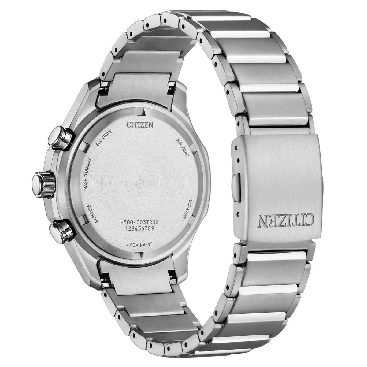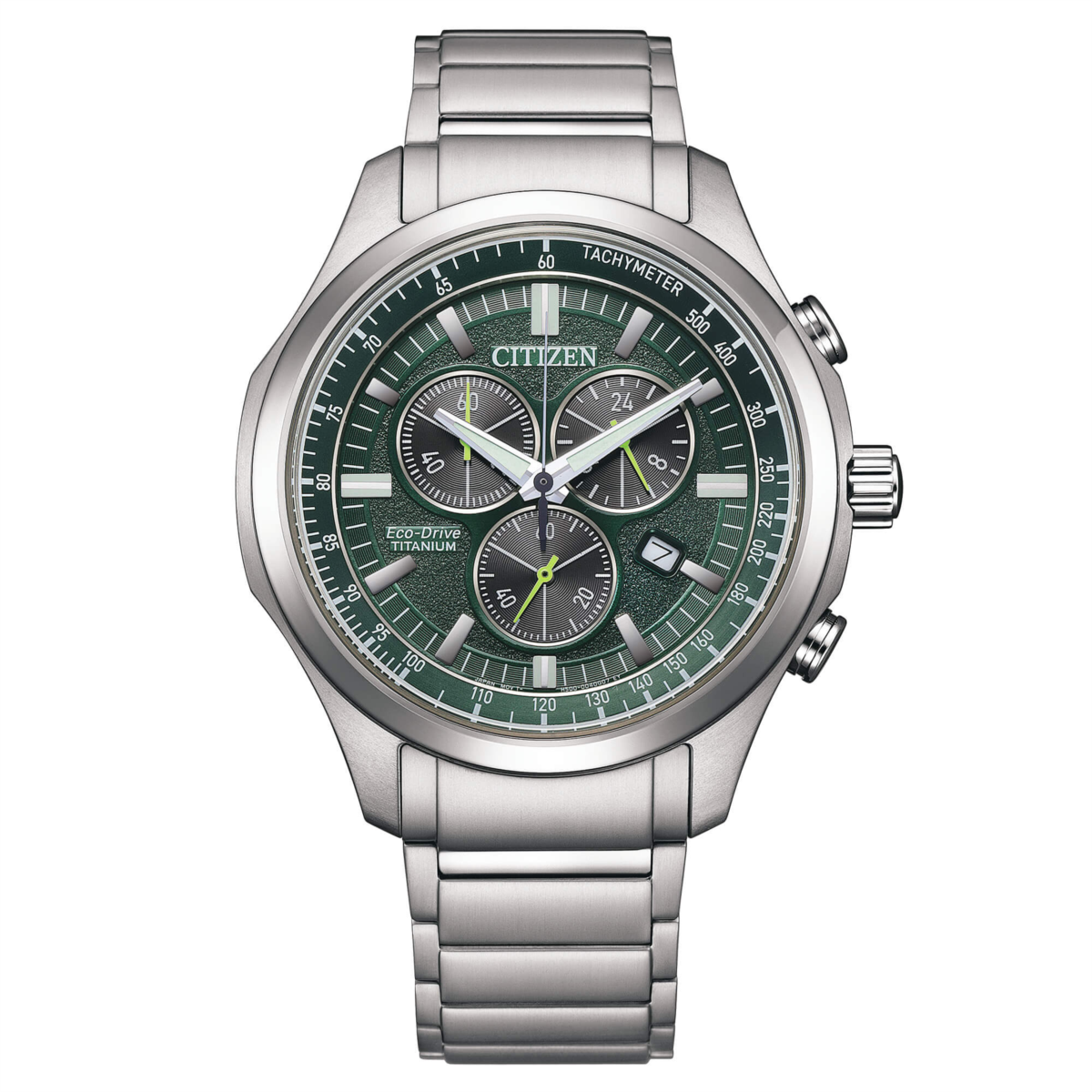 Orologio uomo citizen, AT2530-85X, collezione super titanium chrono, movimento eco-drive, cronografo, cassa in super titanio 43mm, quadrante verde con datario, fondello serrato a vite, vetro zaffiro, bracciale in super titanio, resistenza all'acqua 10atm