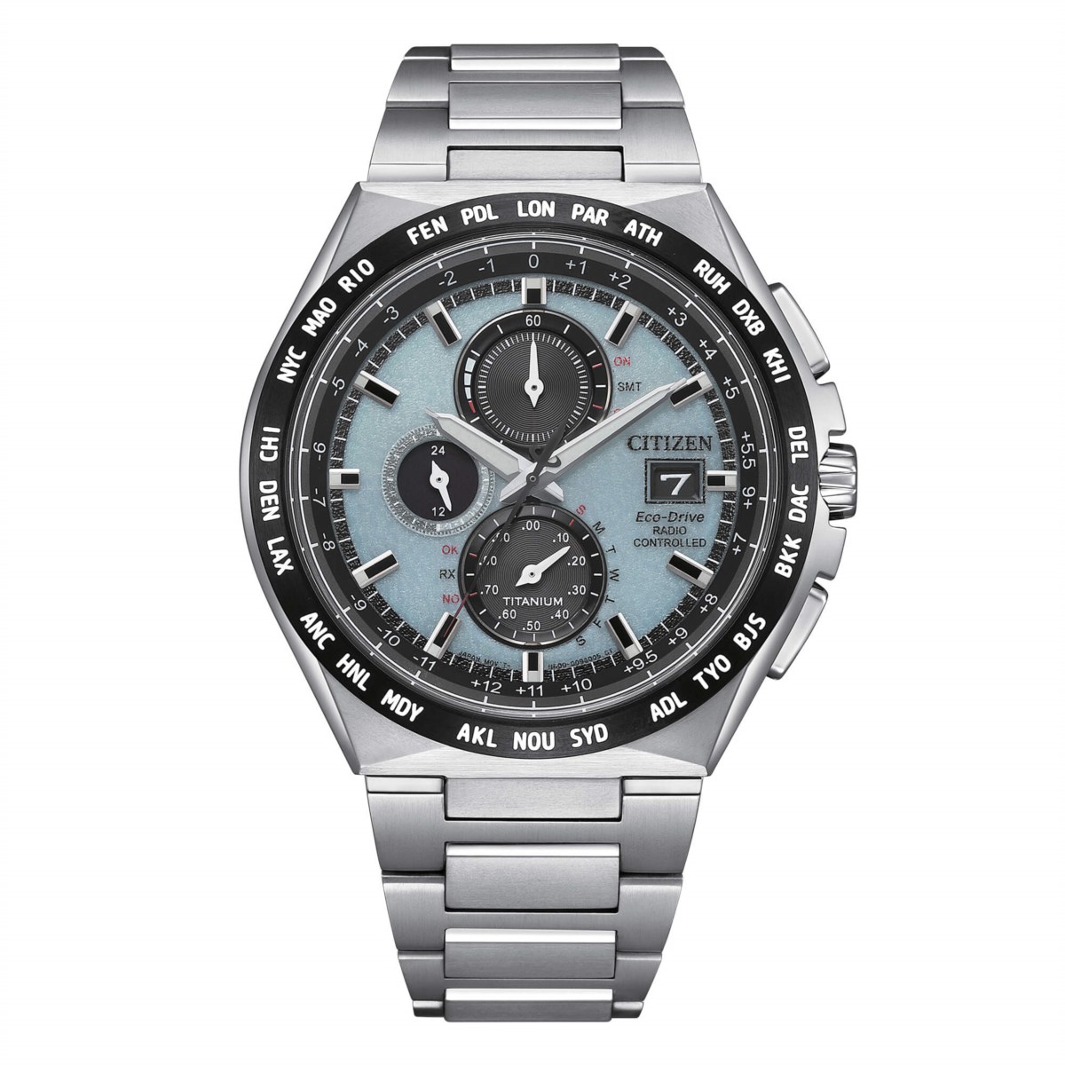 Orologio uomo citizen, AT8238-84M, collezione super titanium chrono, movimento eco drive, radiocontrollato, cassa in titanio 43mm, quadrante ice blu con datario, bracciale in titanio, resistenza all'acqua 20 bar