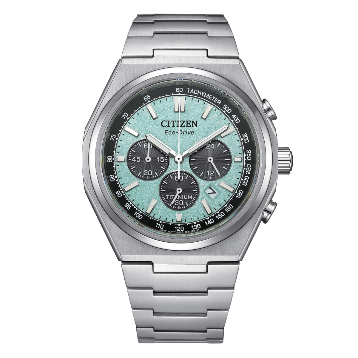Orologio uomo citizen, CA4610-85M, collezione super titanium chrono, movimento eco-drive, cronografo, cassa in titanio 42mm, quadrante turchese con datario, bracciale in titanio, resistenza all'acqua 10atm