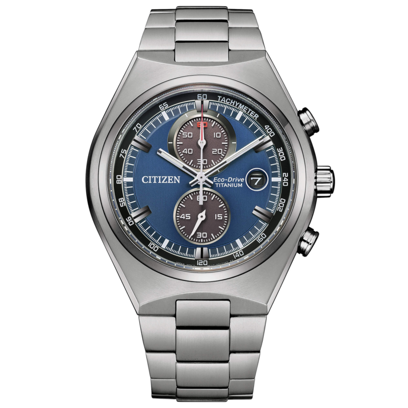 Orologio uomo citizen, Ca7090-87l, collezione super titanium chrono, movimento eco-drive, cronografo, cassa in titanio 43mm, quadrante blu con datario, bracciale in titanio, resistenza all'acqua 10atm
