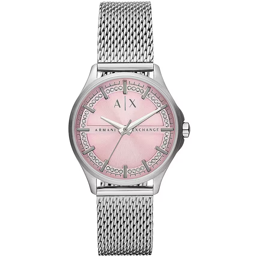 Orologio donna armani exchange, AX5273, collezione hampton, movimento al quarzo, solo tempo, cassa in acciaio 36mm, quadrante rosa, cinturino in maglia milano, resistenza all'acqua 5atm