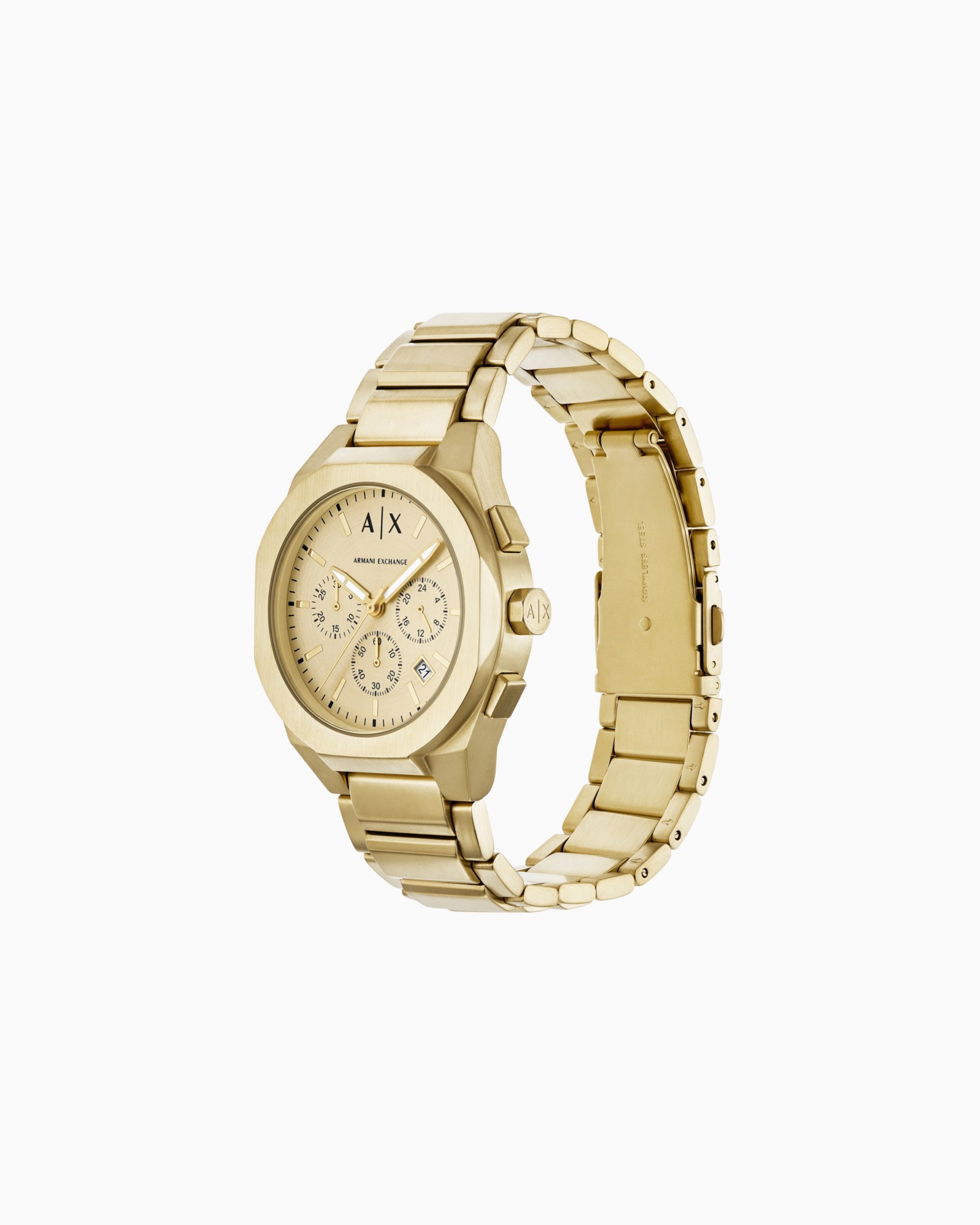 Orologio uomo armani, AX7171SET, collezione sync, movimento al quarzo, cronografo, cassa in acciaio dorato 42mm, quadrante oro con datario, bracciale in acciaio dorato, resistenza all'acqua 5atm