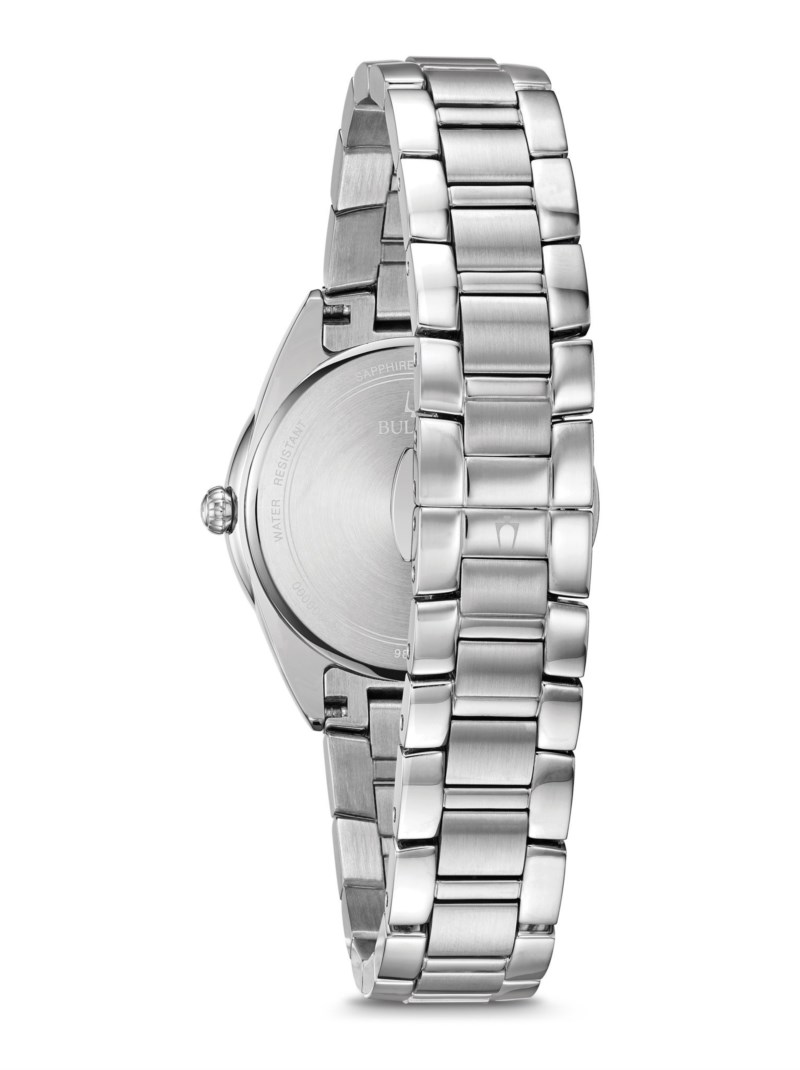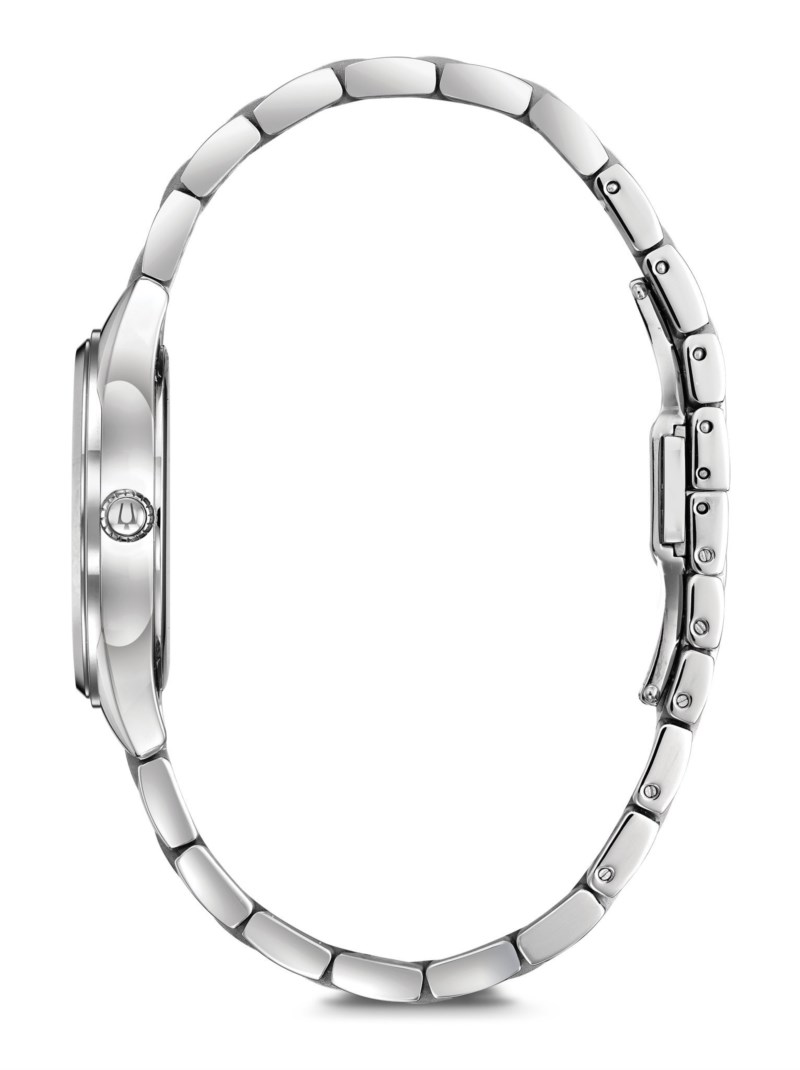 Orologio bulova da donna , 96p198, collezione classic bv, , movimento quarzo, solo tempo, materiale cassa acciaio da 32 mm mm, vetro: zaffiro , quadrante blu madre-perla con 8 diamanti, bracciale in acciaio inox con chiusura deployante.