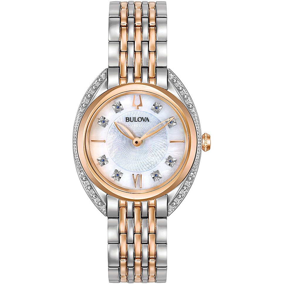 Orologio bulova da donna , 98R270, collezione classic bv, , movimento quarzo, solo tempo, materiale cassa acciaio bicolore da 30 mm, vetro: zaffiro , quadrante madreperla con 8 diamanti, bracciale in acciaio bicolore, chiusura deployante.