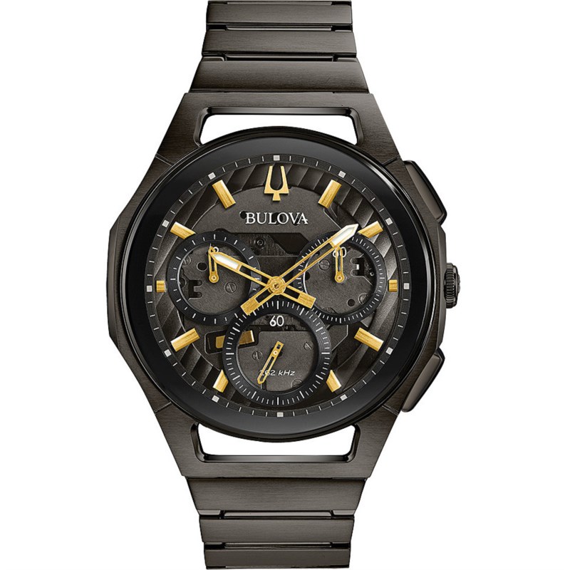 Orologio bulova da uomo, 98a206, collezione curv, , movimento: ad alte prestazioni al quarzo cronografo, materiale cassa acciaio da 44 mm spessa 10.10 mm , quadrante nero con indici dorati , bracciale in acciaio nero , vetro zaffiro antiriflesso, impermeabilità 3 atm