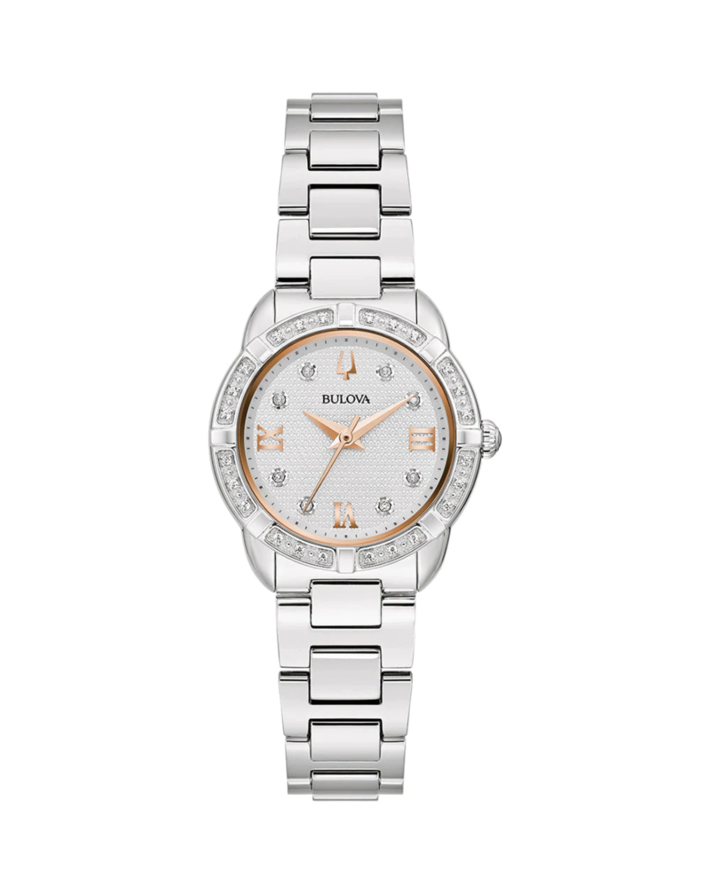 Orologio donna bulova, 96r250, collezione lady, movimento al quarzo, solo tempo, cassa in acciaio 27mm, quadrante con diamanti, bracciale in acciaio, resistenza all'acqua 3atm