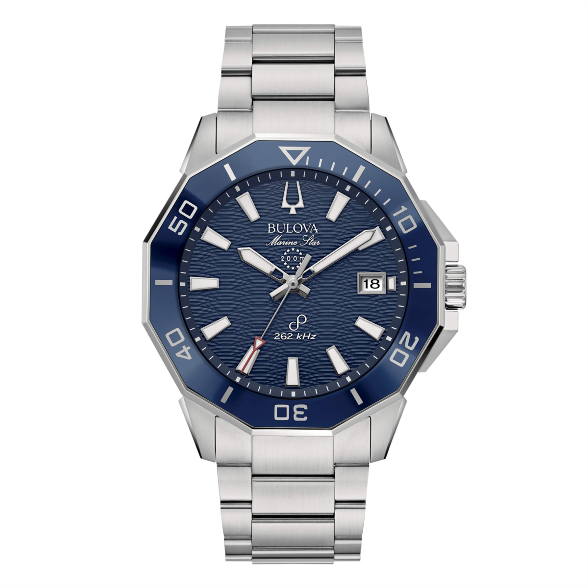 Orologio uomo bulova, 96B433, collezione marine star ceramic, movimento al quarzo, solo tempo, cassa in acciaio 43mm, quadrante blu, cinturino in acciaio, resistenza all'acqua 20 atm