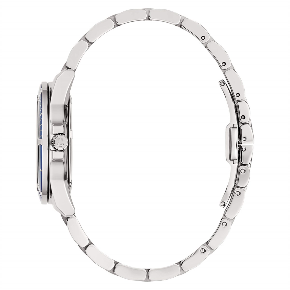 Orologio donna bulova, 96p237, collezione marine star lady, movimento al quarzo, solo tempo, cassa in acciaio 34mm, quadrante blu con datario, indici con diamanti, bracciale in acciaio, resistenza all'acqua 10atm