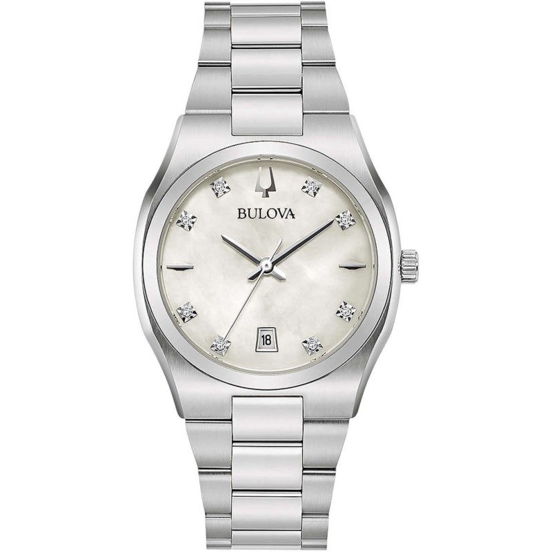 Orologio donna bulova, 96p218, collezione surveyor, movimento al quarzo, solo tempo, cassa in acciaio 34mm, quadrante bianco con diamanti, bracciale in acciaio, resistenza all'acqua 3atm
