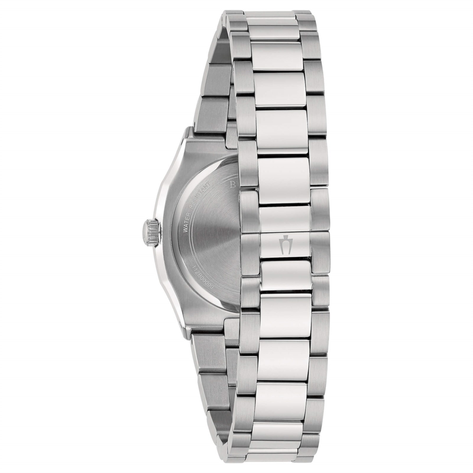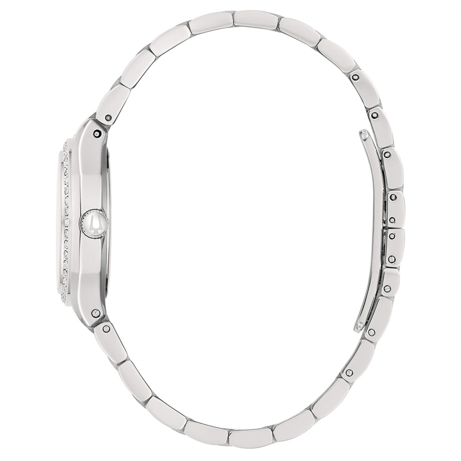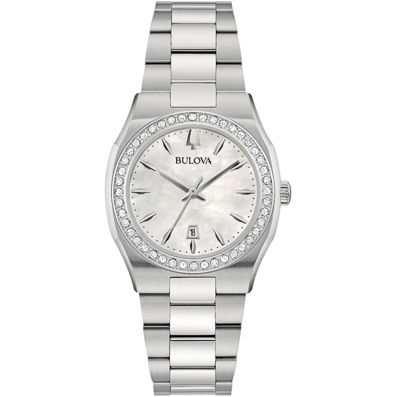 Orologio donna bulova, 96r245, collezione surveyor, movimento al quarzo, solo tempo, cassa in acciaio 31mm, quadrante madreperla con datario, ghiera con 22 diamanti, bracciale in acciaio, resistenza all'acqua 5atm