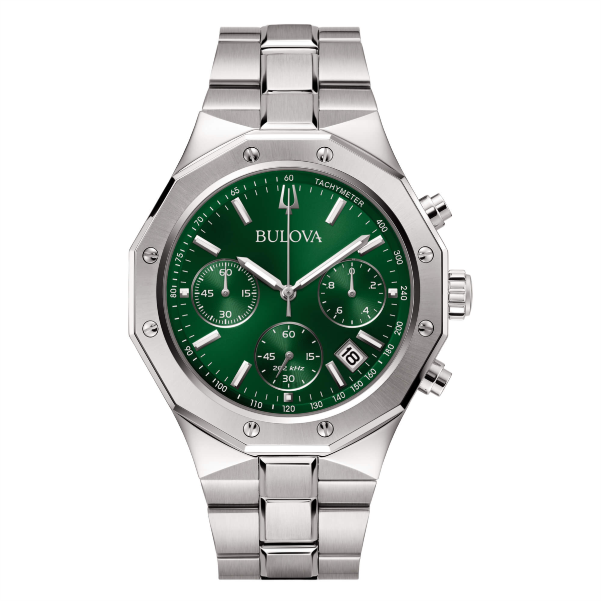 Orologio uomo bulova, 96B409, collezione sutton, movimento al quarzo, cronografo, cassa in acciaio 44mm, quadrante verde con datario, bracciale in acciaio, resistenza all'acqua 3atm