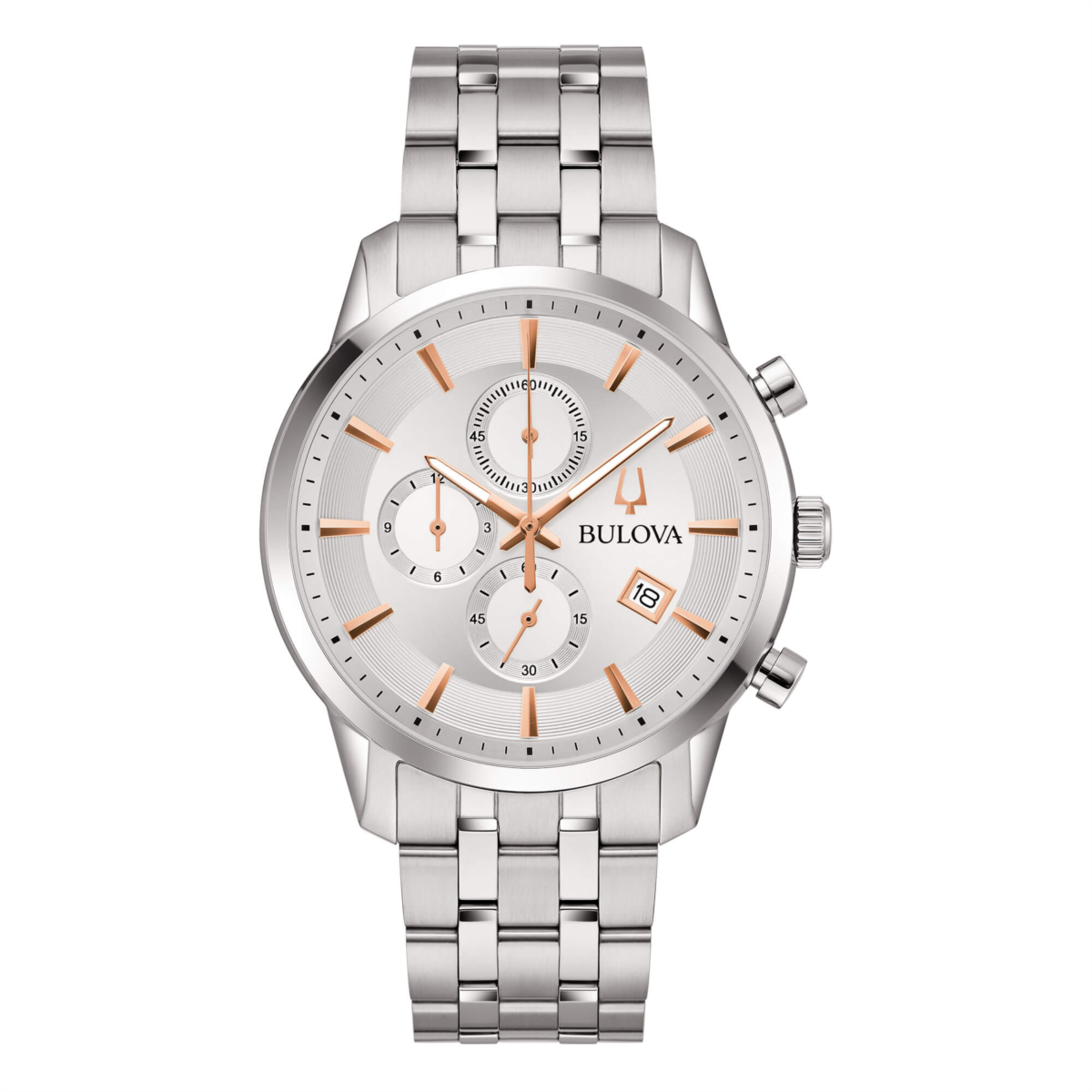 Orologio uomo bulova, 96B411, collezione sutton, movimento al quarzo, cronografo, cassa in acciaio 41mm, quadrante silver con datario, bracciale in acciaio, resistenza all'acqua 3atm