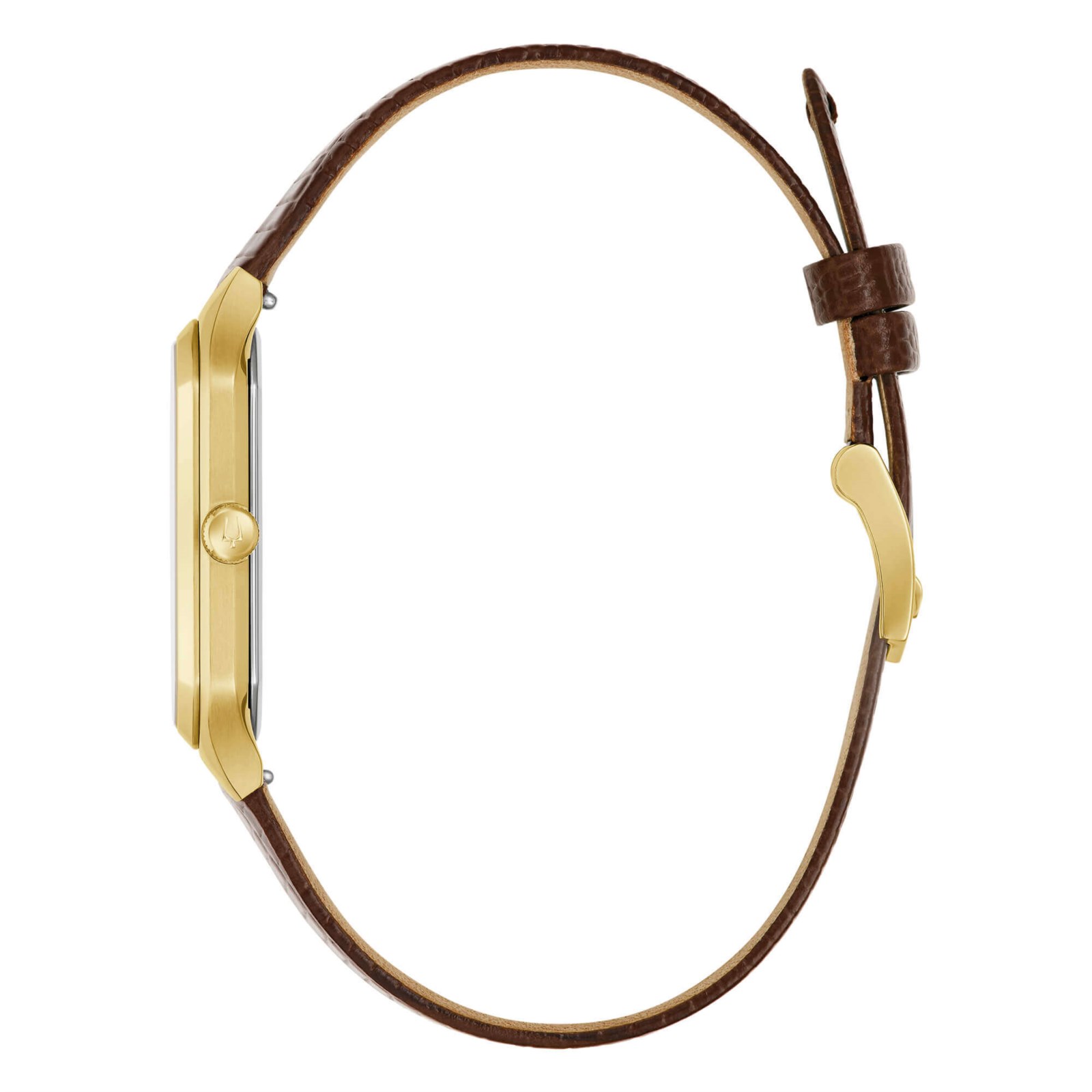Orologio uomo bulova, 97B235, collezione tony bennett , movimento a quarzo, cassa in acciaio dorato 32mm, vetro zaffiro, quadrante nero, cinturino pelle