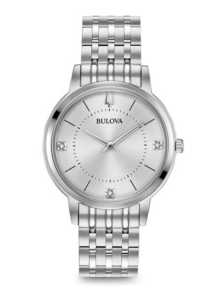 Orologio bulova da donna , 96P183, collezione ultra slim, novità , movimento quarzo, solo tempo, materiale cassa acciaio da 31 mm spessa 5.8mm, vetro: minerale, quadrante argentato bianco con tre diamanti a mano incastonati singolarmente, vetro minerale piatto, bracciale in acciaio inox con chiusura deployante.