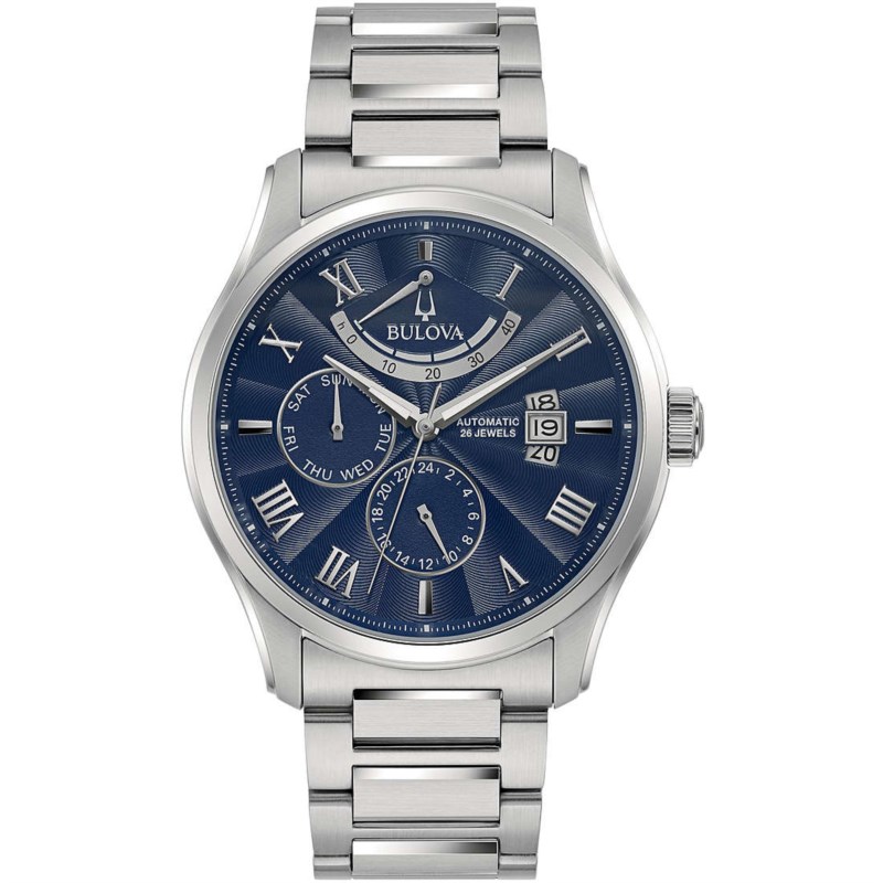 Orologio uomo bulova, 96c147, collezione wilton, movimento automatico, multifunzione, cassa in acciaio 43mm, quadrante blu con datario, bracciale in acciaio, resistenza all'acqua 3atm