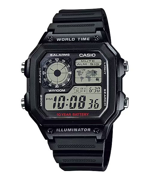 Orologio uomo casio, AE-1200WH-1AVEF, collezione ae-1200, movimento al quarzo, digitale, cassa in resina 45 × 42.1 × 12.5 mm, lunetta in resina, cinturino in resina, resistenza all'acqua 10 bar, peso 39g Vetro in resina, Multi Time (4 città diverse) Ora internazionale 31 fusi orari (48 città + tempo coordinato universale), attivazione/disattivazione dell'ora legale, passaggio dalla città per l'ora del proprio fuso orario alla città per l'ora internazionale, Cronometro, Timer, 5 promemoria sonori giornalieri o singoli, segnale orario, Durata illuminazione selezionabile luce LED, luminescenza, luce led ambra, Calendario automatico completo (fino all'anno 2099), Attivazione/disattivazione del segnale acustico di pressione pulsanti, Precisione: ±30 secondi al mese, Indicazione dell'ora regolare: ora, minuto, secondo, pm, mese, data, giorno del mese