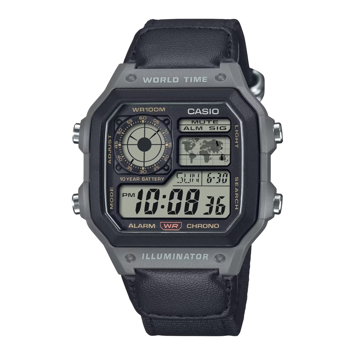 Orologio uomo casio, AE-1200WHUB-8AVEF, collezione ae-1200, movimento al quarzo, digitale, cassa in resina 45 × 42.1 × 12.5 mm, lunetta in resina, cinturino in tessuto, resistenza all'acqua 10 bar, peso 39g Vetro in resina, Multi Time (4 città diverse) Ora internazionale 31 fusi orari (48 città + tempo coordinato universale), attivazione/disattivazione dell'ora legale, passaggio dalla città per l'ora del proprio fuso orario alla città per l'ora internazionale, Cronometro, Timer, 5 promemoria sonori giornalieri o singoli, segnale orario, Durata illuminazione selezionabile luce LED, luminescenza, luce led ambra, Calendario automatico completo (fino all'anno 2099), Attivazione/disattivazione del segnale acustico di pressione pulsanti, Precisione: ±30 secondi al mese, Indicazione dell'ora regolare: ora, minuto, secondo, pm, mese, data, giorno del mese