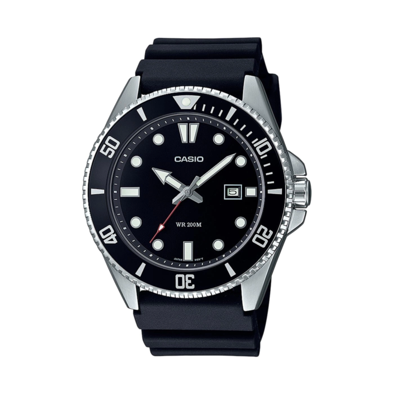Orologio uomo casio, Mdv-107-1a1vef, collezione mdv, movimento al quarzo, solo tempo, cassa in acciaio 44mm, quadrante nero con datario, cinturino in resina, resistenza all'acqua 20atm