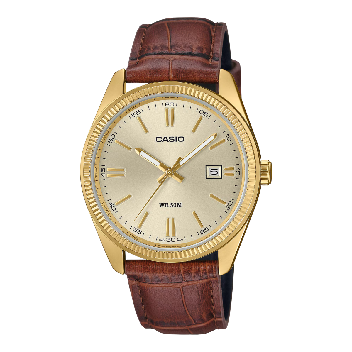 Orologio uomo casio, MTP-1302PGL-9AVEF, collezione mtp-1302, cassa in acciaio dorato 44.2 × 38.5 × 9.4 mm, quadrante oro con datario, cinturino in pelle, resistenza all'acqua 5 bar