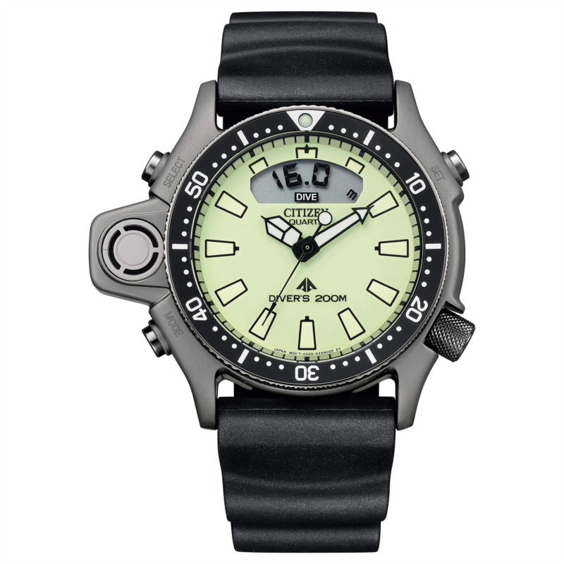 Orologio uomo citizen, jJp2007-17w, collezione aqualand, movimento al quarzo, analogico/digitale, cassa in acciaio 44mm, quadrante marrone, cinturino in cauciù, resistenza all'acqua 20atm. funzioni: orario (ore, minuti e secondi, am/pm), calendario completo, suoneria, cronografo a 1/100 di sec., con rilevazione tempi parziali.