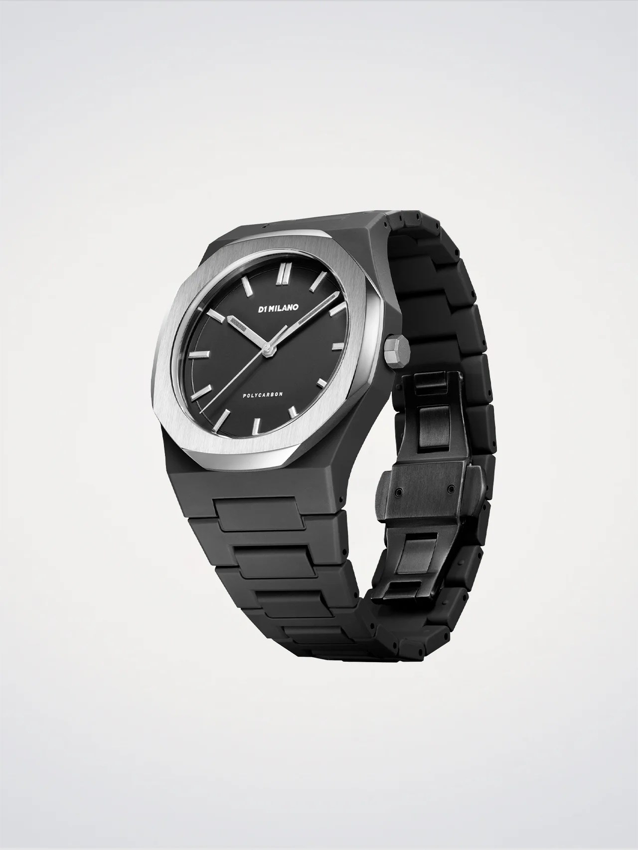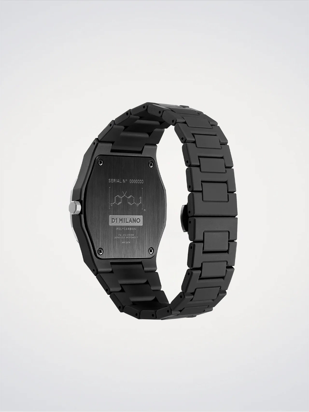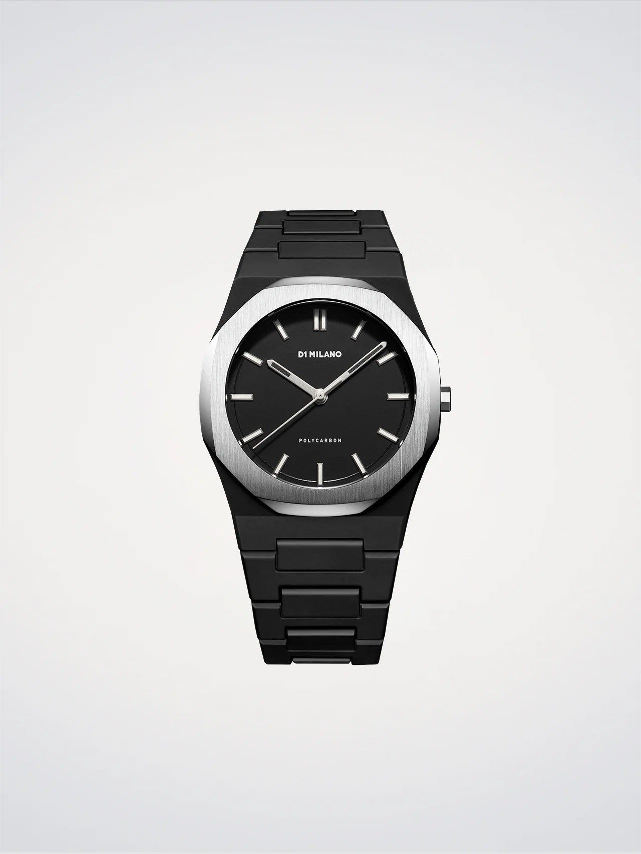 Orologio unisex d1 milano, D1-PCBJ14, collezione polycarbon, movimento al quarzo, solo tempo, cassa in policarbonato 40, 5mm, quadrante nero, ghiera in Acciaio inossidabile argentato, fondello in Acciaio inossidabile nero, inciso, vetro minerale con rivestimento antiriflesso, bracciale in policarbonato, resistenza all'acqua 5atm