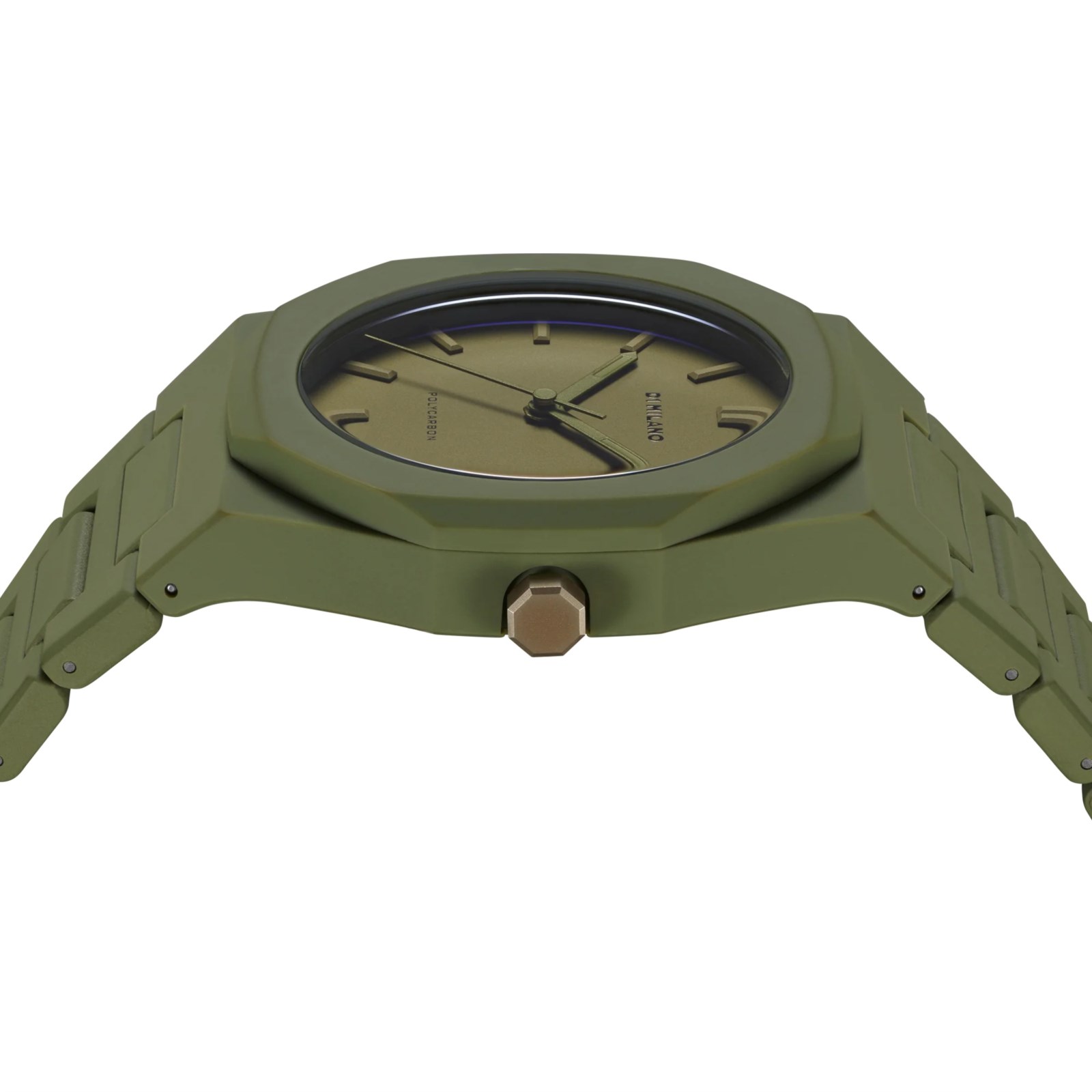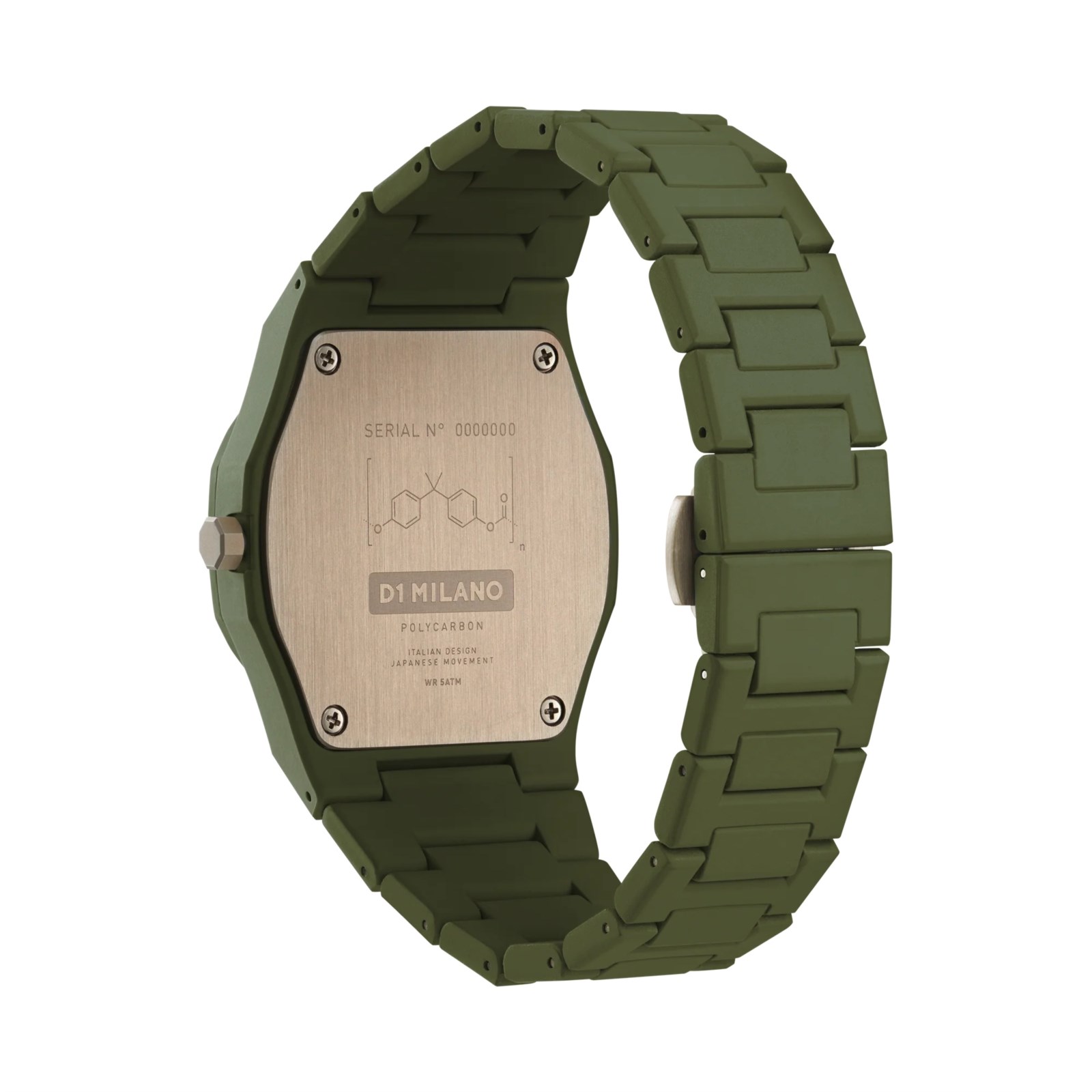 Orologio uomo d1 milano, D1-PCBJ22, collezione polycarbon, movimento al quarzo, solo tempo, cassa in policarbonato 40, 5mm, quadrante verde militare, ghiera in Policarbonato verde militare, fondello in Acciaio inossidabile color cachi, inciso, vetro minerale con rivestimento antiriflesso, bracciale in policarbonato, resistenza all'acqua 5atm