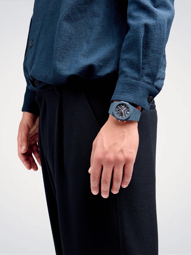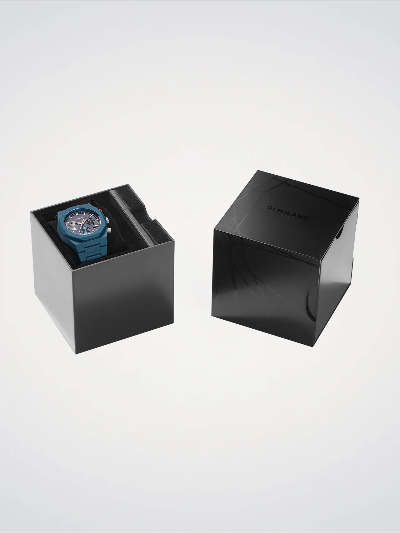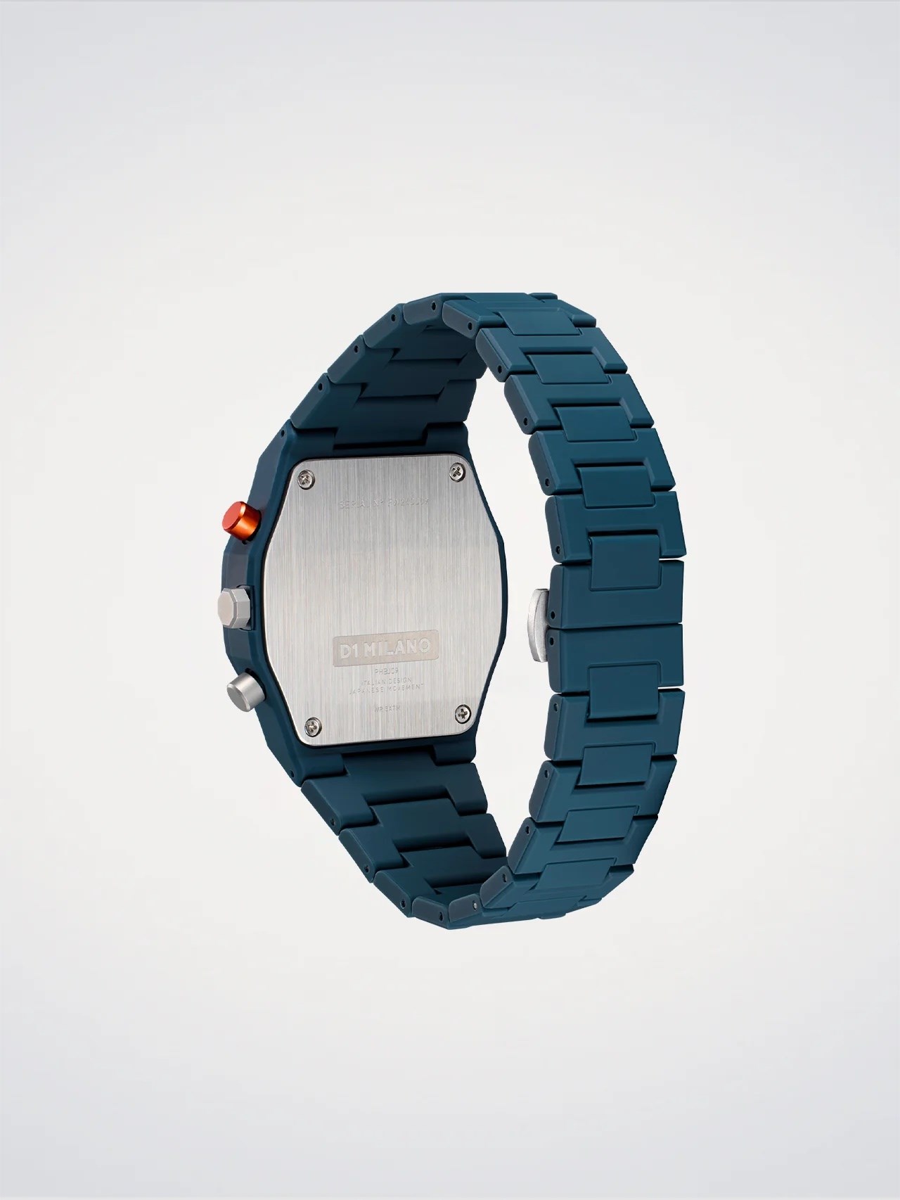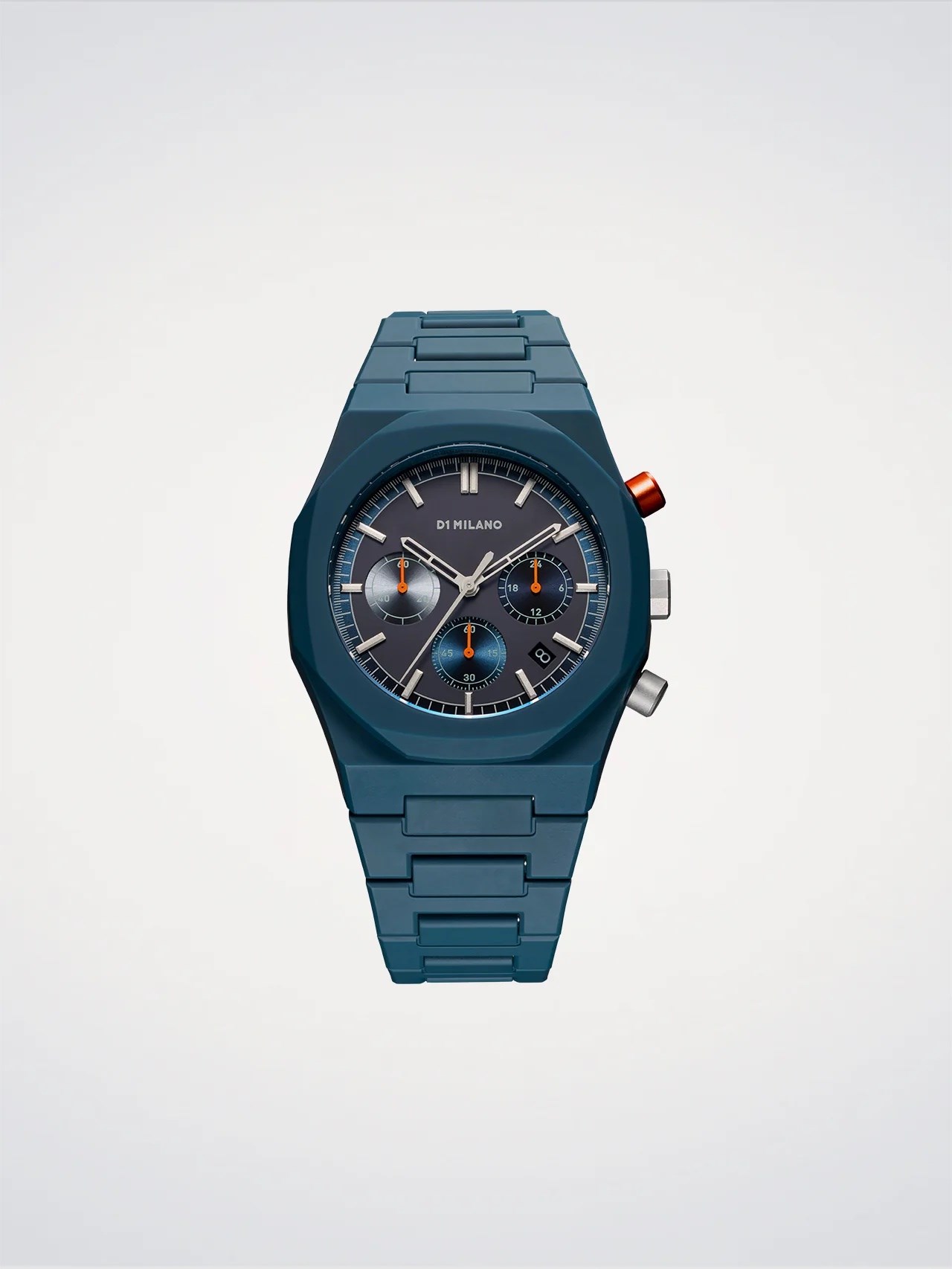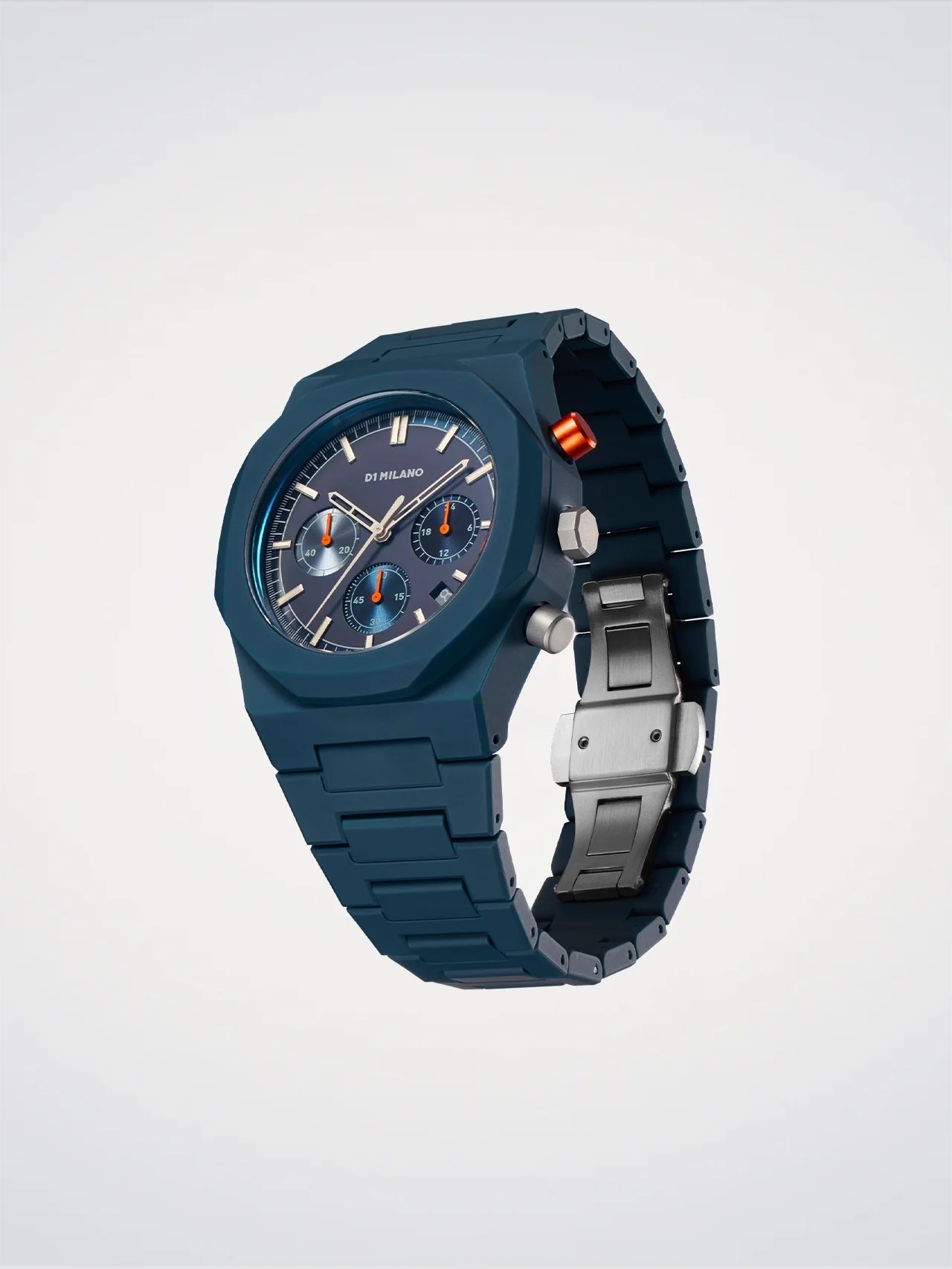 Orologio uomo d1 milano, D1-PHBJ09, collezione polychrono, movimento al quarzo, cronografo, cassa in policarbonato 40, 5mm, quadrante blu opaco con datario, ghiera in policarbonato blu, fondello in Acciaio inossidabile, vetro in rivestimento minerale anti-riflesso, bracciale in policarbonato, resistenza all'acqua 5atm