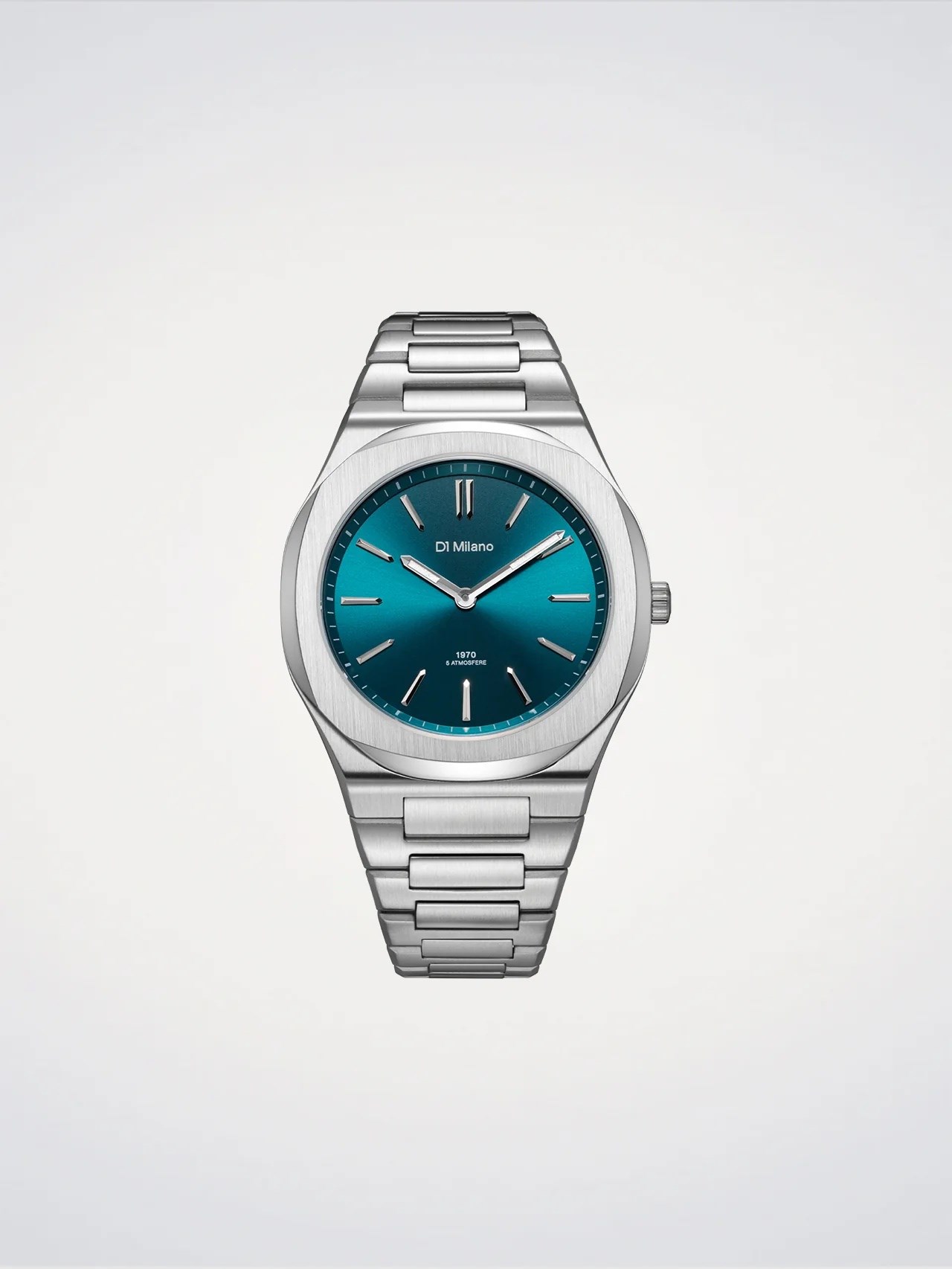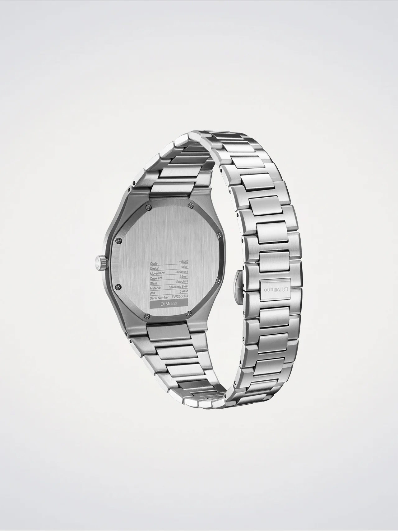 Orologio uomo d1 milano, D1-UHBJ03, collezione ultra thin, movimento al quarzo, solo tempo, cassa in acciaio 39mm, quadrante blu, fondello in acciaio, ghiera in acciaio, bracciale in acciaio, resistenza all'acqua 5atm