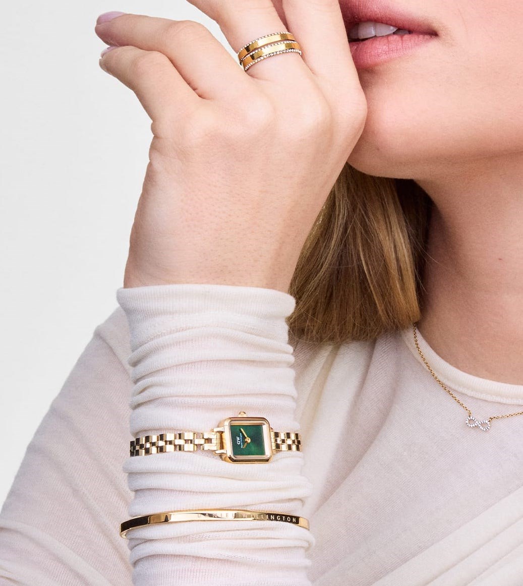 Orologio daniel wellington donna, DW00100852, collezione mini arch, movimento al quarzo, solo tempo, cassa 15, 4mm in acciaio dorato con quadrante verde e cinturino dorato in acciaio. larghezza cinturino 6mm. altezza cassa 18, 2mm.