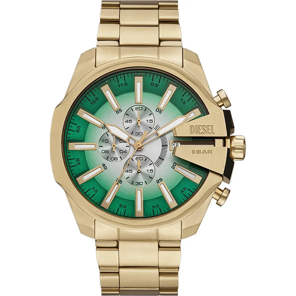 Orologio uomo diesel, DZ4684, collezione mega chief, movimento al quarzo, cronografo con datario, cassa 48mm in acciaio dorato e cinturino in acciaio dorato. resistenza all'acqua 5 ATM.