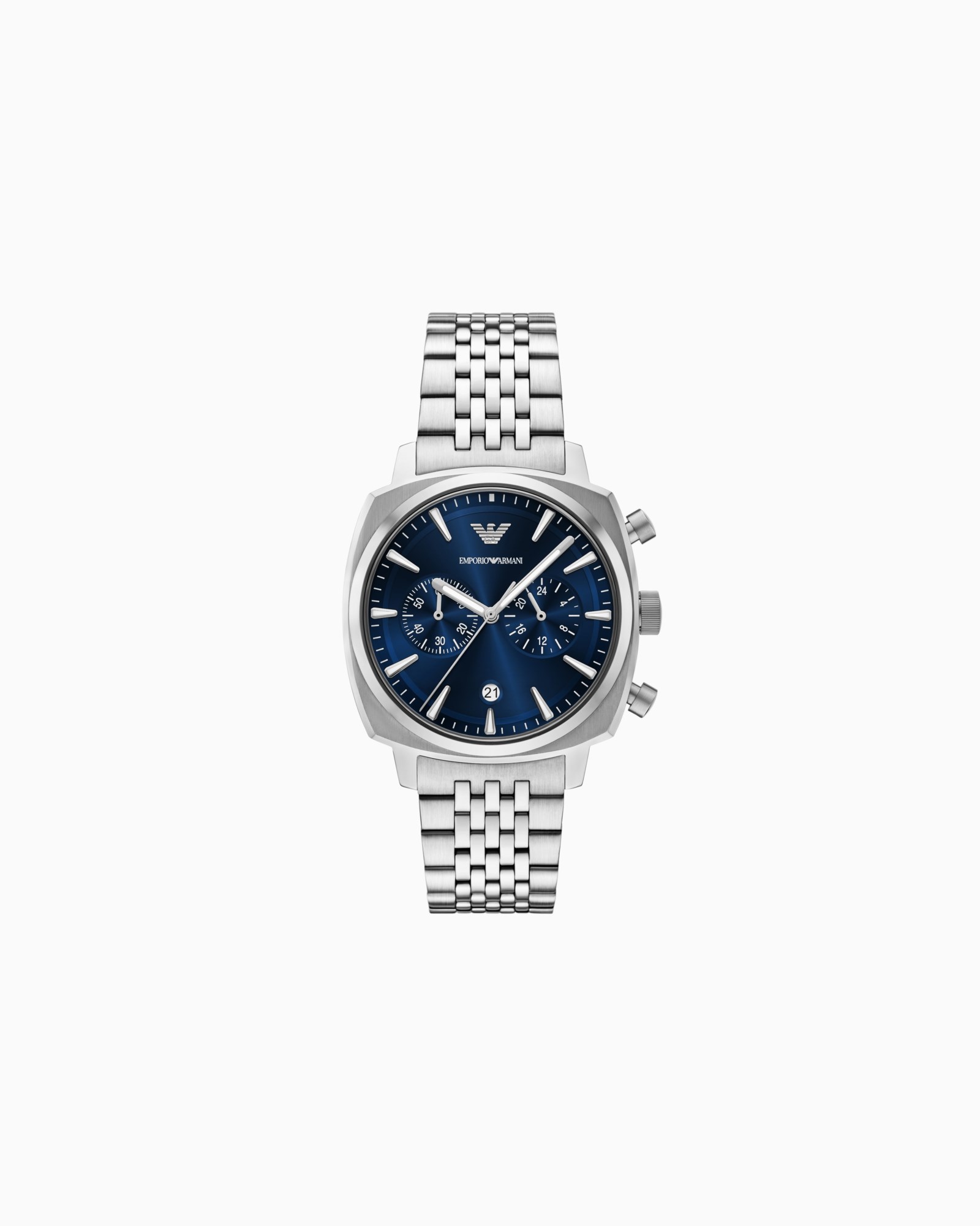 Orologio uomo emporio armani, AR11688, collezione carlo, movimento al quarzo, cronografo, cassa in acciaio 40mm, quadrante blu con datario, bracciale in acciaio, resistenza all'acqua 5atm